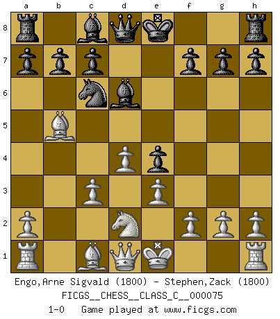 Last move : 1-0 2008 May 24 10:32:15 [Event "FICGS__CHESS__CLASS_C__000075"] [Site "FICGS"] [Date "2008.03.08"] [Round "1"] [White "Engo,Arne Sigvald"] [Black "Stephen,Zack"] [Result "1-0"] [WhiteElo "1800"] [BlackElo "1800"] 1.c4 e5 2.Nc3 Nf6 3.e3 d5 4.cxd5 Nxd5 5.Nf3 Nc6 6.Bb5 Nxc3 7.bxc3 Bd6 8.d4 e4 9.Nd2 1-0 This chess game has been lost on time (started : 2008.03.08 18:15:36) English Opening Player White won this chess game. Follow this game move after move (download)Castle early and often. (Rob Sillars) Ivan Sokolov treibt mich als Beifahrer an mit go Loeky go - . (Loek van Wely) Bobby Fischer es el mas grande genio de Ajedrez de todos los tiempos. (Alexander Kotov) C'est la seule position que je connaisse où les deux camps sont mals. Propos prêtés à V. Anand. A good teacher is like a candle - it consumes itself to light the way for others. (Author unknown)