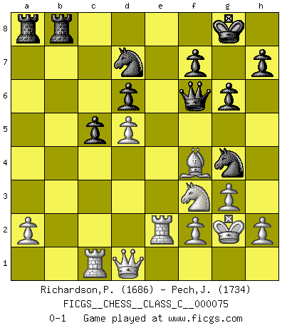 Last move : 0-1 2008 June 12 3:22:11 [Event "FICGS__CHESS__CLASS_C__000075"] [Site "FICGS"] [Date "2008.03.08"] [Round "1"] [White "Richardson,Patrick"] [Black "Pech,Jaroslav"] [Result "0-1"] [WhiteElo "1686"] [BlackElo "1734"] 1.d4 Nf6 2.c4 c5 3.d5 b5 4.cxb5 a6 5.bxa6 Bxa6 6.Nc3 g6 7.e4 Bxf1 8.Kxf1 d6 9.g3 Bg7 10.Kg2 O-O 11.Nf3 Nbd7 12.Re1 Qa5 13.e5 Ng4 14.exd6 exd6 15.Bf4 Rfb8 16.Re2 Bxc3 17.bxc3 Qxc3 18.Rc1 Qf6 0-1 Benko gambit accepted Kingside Castling by player Black (move 10) Player Black won this chess game. Follow this game move after move (download)When you play Bobby, it is not a question if you win or lose. It is a question if you survive. (Boris Spassky) Der Vorposten provoziert a) eine Basis für neue Angriffe und b) eine Schwächung der gegnerischen Widerstandskraft in der fraglichen Linie. (Aaron Nimzowitsch) El jugador táctico debe saber que hacer cuando algo se debe de hacer. El estratégico debe saber que hacer cuando nada se debe de hacer. (Savielly Tartakover) Il n'y a plus de joueurs du niveau de Jacob Murray dont la seule quête est le beau jeu, le plaisir de voir les pièces construire quelque chose. Sur 10 idées à la minute, 9 seront sans intérêt, la dernière s'avèrera géniale. (Christian Bauer) I'll be back. (Arnold Schwarzenegger)