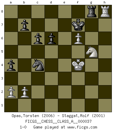 Last move : 1-0 2009 February 19 18:43:59 [Event "FICGS__CHESS__CLASS_A__000037"] [Site "FICGS"] [Date "2008.03.09"] [Round "1"] [White "Opas,Torsten"] [Black "Staggat,Rolf"] [Result "1-0"] [WhiteElo "2006"] [BlackElo "2001"] 1.e4 e5 2.Nf3 Nc6 3.Bb5 Nf6 4.O-O Nxe4 5.d4 Nd6 6.Bxc6 dxc6 7.dxe5 Nf5 8.Qxd8+ Kxd8 9.Rd1+ Ke8 10.h3 Ne7 11.Nc3 Be6 12.Nd4 Rd8 13.Bg5 Bc8 14.Ne4 Rd7 15.e6 fxe6 16.Nc5 Rd6 17.Bf4 e5 18.Bxe5 Rd5 19.Nd3 Ng6 20.Re1 Kf7 21.Nf3 Bd6 22.Ng5+ Kf8 23.Bxd6+ cxd6 24.Ne4 Bf5 25.g4 Bxe4 26.Rxe4 Kf7 27.Rae1 Rd8 28.f4 Rd7 29.Kf2 Re7 30.f5 Ne5 31.Kg3 a5 32.R4e2 a4 33.Nf4 Rb5 34.c4 Ra5 35.Ne6 Kf6 36.h4 h6 37.Rf1 Nxc4 38.g5+ hxg5 39.hxg5+ Kf7 40.Nd8+ Ke8 41.Rxe7+ Kxe7 42.f6+ gxf6 43.gxf6+ Kf8 44.Rh1 Rg5+ 45.Kf4 Rg2 46.Rh8+ Rg8 47.Ne6+ Kf7 48.Ng5+ 1-0 Ruy Lopez : Berlin defense, Open variation Kingside Castling by player White (move 4) Player White won this chess game. Follow this game move after move (download)You are for me the Queen on d8 and I am the Pawn on d7 !! (Eduard Gufeld) Kombinieren und Schwarzhandel gehören verboten. (Savielly Grigorievitsch Tartakower) Las piezas de Ajedrez son los bloques del alfabeto que moldean los pensamientos; y esos pensamientos, aunque hagan un diseño visual en el tablero, expresan abstractamente su belleza como un poema. (Marcel Duchamp) Un millionnaire : 'Monsieur Steinitz ! Vous ne participez aux tournois que pour l'argent, alors que moi je n'y viens que pour l'honneur.' Steinitz : 'Chacun joue pour ce qu'il n'a pas'... You must have a dream in order to have it come true. (A.P.J. Kalam)