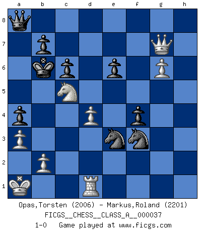 Last move : 1-0 2008 August 8 6:32:53 [Event "FICGS__CHESS__CLASS_A__000037"] [Site "FICGS"] [Date "2008.03.09"] [Round "1"] [White "Opas,Torsten"] [Black "Markus,Roland"] [Result "1-0"] [WhiteElo "2006"] [BlackElo "2201"] 1.e4 c6 2.Nf3 d5 3.d4 dxe4 4.Ng5 Bf5 5.f3 exf3 6.Nxf3 Nf6 7.Bd3 Bxd3 8.Qxd3 e6 9.Bg5 h6 10.Bh4 Nbd7 11.Nbd2 Be7 12.O-O-O Nd5 13.Bxe7 Qxe7 14.Kb1 O-O-O 15.g3 Rhe8 16.Rhe1 Kb8 17.c4 N5f6 18.Qc3 Ng4 19.Re2 Qf6 20.Ne4 Qf5 21.Nh4 Qh7 22.Ka1 Nb6 23.Qb4 Nf6 24.Nd6 Re7 25.Nf3 Red7 26.c5 Nfd5 27.Qb3 Rxd6 28.cxd6 Rxd6 29.Ne5 Qf5 30.g4 Qf6 31.R2e1 Qe7 32.Qg3 Kc7 33.h4 f6 34.Nd3 Kb8 35.Nc5 Nc7 36.g5 hxg5 37.hxg5 f5 38.Qb3 Ncd5 39.Re5 a5 40.Rde1 f4 41.Rf1 Ka7 42.Rh1 Qf7 43.a3 Qe8 44.Qc2 Qg8 45.Qc1 Nd7 46.Ne4 Nxe5 47.Qc5+ Ka6 48.Qxd6 Nf3 49.Nc5+ Kb6 50.Rd1 a4 51.Qd7 Qa8 52.Qxg7 Ne3 53.g6 1-0 Caro-Kann defense Queenside Castling by player White (move 12) Queenside Castling by player Black (move 14) Player White won this chess game. Follow this game move after move (download)When I asked Fischer why he had not played a certain move in our game, he replied: 'Well, you laughed when I wrote it down !' (Mikhail Tal) Wer sich die Fähigkeit anerziehen will im Schach selbstständig zu denken, der muß alles meiden, was leblos ist: ausgeklügelte Theorien, die sich auf sehr wenige Beispiele und eine Menge Hirngespinste stützen. (Emanuel Lasker) Bobby es la celebridad menos entendida y malinterpretada que camina el la faz de esta tierra. (Yasser Seirawan) La menace est plus forte que l'exécution. (Aaron Nimzovitch) The question of whether computers can think is just like question of whether submarines can swim. (Edsger W. Dijkstra)
