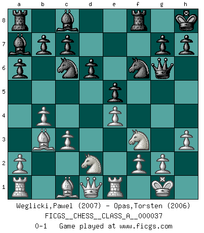 Last move : 0-1 2008 June 29 13:45:24 [Event "FICGS__CHESS__CLASS_A__000037"] [Site "FICGS"] [Date "2008.03.09"] [Round "1"] [White "Weglicki,Pawel"] [Black "Opas,Torsten"] [Result "0-1"] [WhiteElo "2007"] [BlackElo "2006"] 1.e4 e5 2.Nf3 Nc6 3.Bb5 a6 4.Ba4 Bd6 5.c3 f5 6.d3 fxe4 7.dxe4 Nf6 8.Bb3 Bc5 9.O-O d6 10.h3 Qe7 11.Bc2 Ba7 12.b4 O-O 13.Nbd2 Qe8 14.Re1 Qg6 15.Bb3+ Kh8 0-1 Ruy Lopez Kingside Castling by player White (move 9) Kingside Castling by player Black (move 12) Player Black won this chess game. Follow this game move after move (download)One of these modest little moves may be more embarrassing to your opponent than the biggest threat. (Siegbert Tarrasch) Die meiste Zeit treffe ich auf Gegner, die meine Enkel sein könnten. Ich bin da, um ihnen zu zeigen, dass sie von mir noch einiges lernen können. (Viktor Kortschnoi) Vive, pierde y aprende al observar a tu oponente como ganar. (Amber Steenbock) Il vaut mieux sacrifier les pièces de l'adversaire. (Xavier Tartacover) Empty your mind, be formless, shapeless — like water. (Bruce Lee)