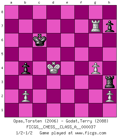 Last move : 1/2-1/2 2008 June 4 23:3:5 [Event "FICGS__CHESS__CLASS_A__000037"] [Site "FICGS"] [Date "2008.03.09"] [Round "1"] [White "Opas,Torsten"] [Black "Godat,Terry"] [Result "1/2-1/2"] [WhiteElo "2006"] [BlackElo "2088"] 1.e4 e5 2.Nf3 Nc6 3.Bb5 a6 4.Ba4 Nf6 5.O-O Be7 6.Nc3 b5 7.Bb3 O-O 8.d3 d6 9.Nd5 Na5 10.Bd2 Nxb3 11.Nxe7+ Qxe7 12.axb3 Nd7 13.c4 Bb7 14.Bg5 f6 15.Be3 f5 16.exf5 Rxf5 17.Nd2 Rf7 18.Ne4 Nf8 19.Qd2 Ne6 20.f3 R7f8 21.Rfd1 c5 22.b4 bxc4 23.dxc4 Bxe4 24.Qxd6 Qxd6 25.Rxd6 Bf5 26.g4 Bxg4 27.fxg4 Nd4 28.R1xa6 Rxa6 29.Rxa6 cxb4 30.c5 Rc8 31.Bxd4 exd4 32.c6 Kf7 33.Kf2 Ke6 34.Ke2 Kd6 35.Kd3 Rf8 36.Ra7 Kxc6 37.Rxg7 Rf3+ 38.Ke4 Rh3 39.Kxd4 1/2-1/2 Ruy Lopez : Closed defense Kingside Castling by player White (move 5) Kingside Castling by player Black (move 7) 10 pieces endgame at move 37 : White KRPPP , Black KRPPP WHITE : King + 1 Rook 3 Pawns BLACK : King + 1 Rook 3 Pawns 9 pieces endgame at move 39 : White KRPPP , Black KRPP WHITE : King + 1 Rook 3 Pawns BLACK : King + 1 Rook 2 Pawns This chess game ended in a draw. Follow this game move after move (download)The tactician must know what to do whenever something needs doing; the strategist must know what to do when nothing needs doing. (Savielly Tartakover) Was ist der Unterschied zwischen einem Strassenarbeiter und einem Schachspieler? --Der Schachspieler bewegt sich ab und zu. (Anonymous) Dios mío, Bobby Fischer juega tan simple. (Alexei Suetin) Les Echecs mettent en conflit, non pas deux intelligences, mais deux volontés. (Lasker) Memory... is the diary that we all carry with us. (Oscar Wilde, The Importance of Being Earnest)