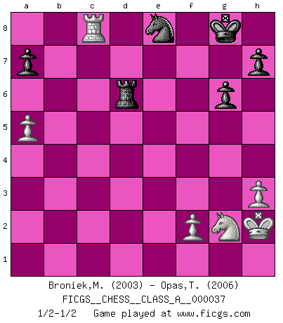 Last move : 1/2-1/2 2008 November 1 23:3:10 [Event "FICGS__CHESS__CLASS_A__000037"] [Site "FICGS"] [Date "2008.03.09"] [Round "1"] [White "Broniek,Mariusz Maciej"] [Black "Opas,Torsten"] [Result "1/2-1/2"] [WhiteElo "2003"] [BlackElo "2006"] 1.d4 Nf6 2.c4 g6 3.Nc3 d5 4.cxd5 Nxd5 5.e4 Nxc3 6.bxc3 Bg7 7.Bc4 c5 8.Ne2 Nc6 9.Be3 O-O 10.O-O Qc7 11.Rc1 Rd8 12.Bf4 Be5 13.Bxe5 Nxe5 14.Bb3 c4 15.Bc2 Ng4 16.Ng3 e5 17.h3 Nf6 18.Qf3 Ne8 19.Rfd1 exd4 20.cxd4 b5 21.e5 Rb8 22.Qe3 Bb7 23.Qg5 Bd5 24.Nf5 Rd7 25.Nh6+ Kh8 26.Ng4 Qd8 27.Qh6 Kg8 28.Ne3 Be6 29.d5 Bxd5 30.a4 b4 31.Rd4 Be6 32.Rh4 f5 33.g4 b3 34.gxf5 bxc2 35.fxe6 Rb1 36.exd7 Rxc1+ 37.Kh2 Qxd7 38.Rxc4 Re1 39.Rxc2 Qb7 40.Ng2 Rxe5 41.Qd2 Qd5 42.Qc3 Qd6 43.Kg1 Re4 44.a5 Qd4 45.Qxd4 Rxd4 46.Rc6 Rd1+ 47.Kh2 Rd6 48.Rc8 1/2-1/2 King's Indian defense, 3.Nc3 Kingside Castling by player Black (move 9) Kingside Castling by player White (move 10) This chess game ended in a draw. Follow this game move after move (download)There must have been a time when men were demigods, or they could not have invented Chess. (Gustav Schenk) Nicht daß Diemer aus Opportunismus Mitglied der NSDAP geworden wäre. Er war ein Fanatiker, in allem, was er tat. (Hans Ree) La mitad de las variaciones que son calculadas en una partida de torneo, resultan ser completamente superfluas. Desafortunadamente, nadie sabe por adelantado cual mitad. (Jan Tinman) Les échecs sont un jeu terrible. Si vous n'avez pas le centre, votre adversaire a une position plus libre. Par contre, si vous avez le centre, alors vous avez vraiment quelque chose pour laquelle vous inquiéter ! (Siegbert Tarrasch) Warrior pose battles inner weakness and wins focus. You see that there is no war within you. You're on your own side, and you are your own strength. (Terri Guillemets)