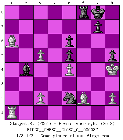 Last move : 1/2-1/2 2008 November 2 16:55:2 [Event "FICGS__CHESS__CLASS_A__000037"] [Site "FICGS"] [Date "2008.03.09"] [Round "1"] [White "Staggat,Rolf"] [Black "Bernal Varela,Nelson"] [Result "1/2-1/2"] [WhiteElo "2001"] [BlackElo "2018"] 1.e4 c5 2.Nf3 d6 3.d4 cxd4 4.Nxd4 Nf6 5.Nc3 a6 6.f3 e5 7.Nb3 Be6 8.Be3 Be7 9.Qd2 Nbd7 10.g4 b5 11.a4 bxa4 12.Rxa4 O-O 13.Rxa6 Rxa6 14.Bxa6 Nb6 15.O-O d5 16.g5 d4 17.gxf6 Bxf6 18.Bf2 Bg5 19.Qd3 dxc3 20.Qxd8 Rxd8 21.bxc3 Nc4 22.Nc5 Nd2 23.Nxe6 fxe6 24.Ra1 Nxf3+ 25.Kg2 Nh4+ 26.Kh3 Ng6 27.Kg4 Rf8 28.Bg3 Bd2 29.c4 Nf4 30.c5 h5+ 31.Kh4 Bb4 32.Bf2 Ne2 1/2-1/2 Sicilian : Najdorf Kingside Castling by player Black (move 12) Kingside Castling by player White (move 15) This chess game ended in a draw. Follow this game move after move (download)All that matters on the Chessboard is good moves. (Bobby Fischer) Ich tröste mich mit dem Vergnügen, daß Schachfans, Zuschauer und Leser glücklich sind, wenn ein Großmeister etwas riskiert, statt nur Klötzchen zu schieben. (Mikhail Nekhemyevich Tal) Si pudieramos observar el interior de la cabeza de un jugador de Ajedrez, encontraríamos ahí un mundo lleno de sentimientos, imágenes, ideas, emoción y pasión. (Alfred Binet) Le plus grand jeu de l'esprit jamais inventé, plus vous l'apprenez, plus vous y prenez du plaisir. (Garry Kasparov) Bobby never cared about money, though. His only desire was to prove that his choices were correct: He wanted chess to be important because he was a chess player, and he wanted to be important. Bobby knew money was important, but he didn't have a clue why, outside of clothes and status. The only way he could accomplish what he wanted was to fight for a lot of money. Once he got it, he gave it away. He did not know how to spend it. And once he'd become champion, after, essentially, sacrificing his life for it, he didn't know how to spend his time. (Bob Wade)