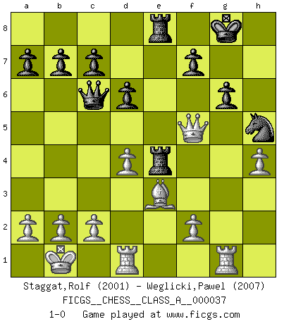 Last move : 1-0 2008 July 2 2:8:3 [Event "FICGS__CHESS__CLASS_A__000037"] [Site "FICGS"] [Date "2008.03.09"] [Round "1"] [White "Staggat,Rolf"] [Black "Weglicki,Pawel"] [Result "1-0"] [WhiteElo "2001"] [BlackElo "2007"] 1.e4 e5 2.Nf3 Nf6 3.Nxe5 d6 4.Nf3 Nxe4 5.Nc3 Nxc3 6.dxc3 Nd7 7.Bf4 Be7 8.Qd2 O-O 9.O-O-O Nc5 10.h4 Re8 11.Bc4 Be6 12.Bxe6 Nxe6 13.Be3 Qd7 14.Qd3 Qc6 15.Qf5 g6 16.Qh3 h5 17.g4 Ng7 18.gxh5 Nxh5 19.Kb1 Bf6 20.Rhg1 Re4 21.Nd4 Bxd4 22.cxd4 Rae8 23.Qf5 1-0 Petrov : Nimzovich attack Kingside Castling by player Black (move 8) Queenside Castling by player White (move 9) Player White won this chess game. Follow this game move after move (download)War is the child of passion, passion is the child of narcissism and narcissism is the child. (...) Another game ? (Thibault de Vassal) Die Elozahlen sind sehr schlecht für das Schach. Jetzt ist Schach eine Sportindustrie, die darauf zielt Elopunkte zu machen. (Miguel Najdorf) En la perfecta combinación de Ajedrez como en una historia corta de primera clase, toda la trama y contra trama deberá conducir hacia un final sorprendente, el interes no es mitigado hasta el último momento. (Yates and Winter) Les échecs sont utiles à l'exercice de la faculté de penser et à celle de l'imagination. Car nous devons posséder une méthode élaborée pour atteindre des buts partout où nous devons conduire notre raison. (Leibnitz) Nobody is always a winner, and anybody who says he is, is either a liar or doesn't play poker. (Amarillo Slim)