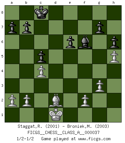 Last move : 1/2-1/2 2008 September 3 13:34:28 [Event "FICGS__CHESS__CLASS_A__000037"] [Site "FICGS"] [Date "2008.03.09"] [Round "1"] [White "Staggat,Rolf"] [Black "Broniek,Mariusz Maciej"] [Result "1/2-1/2"] [WhiteElo "2001"] [BlackElo "2003"] 1.e4 c6 2.d4 d5 3.Nc3 dxe4 4.Nxe4 Bf5 5.Ng3 Bg6 6.h4 h6 7.Nf3 Nd7 8.h5 Bh7 9.Bd3 Bxd3 10.Qxd3 Qc7 11.Bd2 e6 12.O-O-O O-O-O 13.Ne4 Ngf6 14.g3 Nxe4 15.Qxe4 Be7 16.Kb1 Qb6 17.c4 Qa6 18.Qe2 Bd6 19.Rh4 Rhe8 20.Ne5 Nxe5 21.dxe5 Bf8 22.Rf4 Re7 23.Bc3 Qb6 24.Rfd4 Rxd4 25.Bxd4 c5 26.Bc3 Qc6 27.Rd6 Qh1+ 28.Kc2 Rd7 29.Qd1 Qxd1+ 30.Rxd1 Rxd1 31.Kxd1 Be7 32.Bd2 f5 33.exf6 Bxf6 1/2-1/2 Caro-Kann : Classical, 7...Nd7 Queenside Castling by player White (move 12) Queenside Castling by player Black (move 12) This chess game ended in a draw. Follow this game move after move (download)Before the endgame, the Gods have placed the middle game. (Siegbert Tarrasch) Um dein Spiel zu verbessern musst du zuallererst das Endspiel studieren, denn diese kann unabhängig studiert werden. Die Eröffnung und das Mittelspiel müssen immer in Bezug gesetzt werden zum Endspiel. (José Raúl Capablanca) No todos los artistas son jugadores de Ajedrez, pero todos los jugadores de Ajedrez son artistas. (Marcel Duchamp) La tactique est l'élément le plus important du milieu de jeu. (Siegbert Tarrasch) The intuitive mind is a sacred gift; the rational mind is a faithful servant. We have created a society that honors the servant but has forgotten the gift. (Albert Einstein)