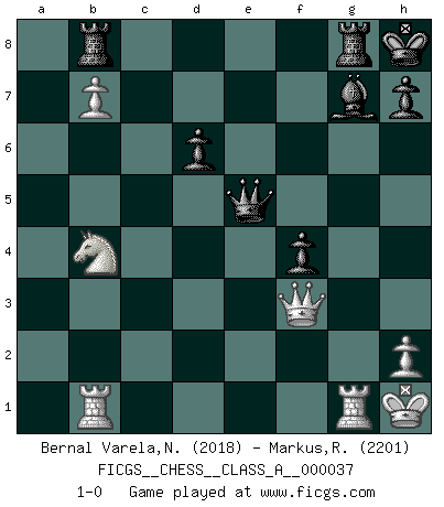 Last move : 1-0 2008 August 19 11:14:0 [Event "FICGS__CHESS__CLASS_A__000037"] [Site "FICGS"] [Date "2008.03.09"] [Round "1"] [White "Bernal Varela,Nelson"] [Black "Markus,Roland"] [Result "1-0"] [WhiteElo "2018"] [BlackElo "2201"] 1.e4 c5 2.Nf3 Nc6 3.d4 cxd4 4.Nxd4 e5 5.Nb5 d6 6.N1c3 a6 7.Na3 b5 8.Nd5 Nge7 9.Bd3 Nxd5 10.exd5 Nd4 11.c3 Nf5 12.Nc2 Bd7 13.Nb4 Ne7 14.O-O a5 15.Nc2 Rc8 16.Qe2 Nxd5 17.Bxb5 Be7 18.Rd1 Rc5 19.Bxd7+ Qxd7 20.Be3 Nxe3 21.Nxe3 O-O 22.Nd5 Qe6 23.c4 Bg5 24.b3 Re8 25.Rd3 e4 26.Rd4 f5 27.Rad1 Rc6 28.f3 exf3 29.Qxf3 Rc5 30.R4d3 Bh6 31.Qh5 f4 32.Qh4 a4 33.Qf2 Qf5 34.Re1 R5c8 35.Rd4 axb3 36.axb3 Kf8 37.Rf1 Kg8 38.g3 Rb8 39.b4 g5 40.gxf4 gxf4 41.b5 Kh8 42.Kh1 Qe5 43.b6 Re6 44.Rd3 Qe4+ 45.Qf3 Qxc4 46.Rc3 Qd4 47.Rc7 Rg8 48.Rb1 Qe5 49.R7c1 R6e8 50.b7 Bg7 51.Rg1 Rb8 52.Nb4 1-0 Sicilian : Labourdonnais-Loewenthal (Kalashnikov) variation Kingside Castling by player White (move 14) Kingside Castling by player Black (move 21) Player White won this chess game. Follow this game move after move (download)I played Chess with him and would have beaten him sometimes only he always took back his last move, and ran the game out differently. (Mark Twain) Wie gewinnt Tal? Er entwickelt alle seine Figuren in die Brettmitte und opfert sie dann irgendwo. (Robert James Fischer) Todo lo que importa ante el tablero de Ajedrez son buenas jugadas. (Bobby Fischer) Le thème de l'attaque double intervient d'une manière ou d'une autre dans l'immense majorité des combinaisons. (Youri Averbakh) Some people are so afraid to die that they never begin to live. (Henry Van Dyke)