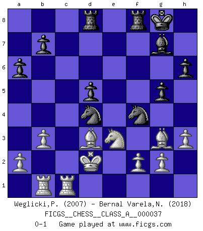 Last move : 0-1 2008 June 28 1:31:40 [Event "FICGS__CHESS__CLASS_A__000037"] [Site "FICGS"] [Date "2008.03.09"] [Round "1"] [White "Weglicki,Pawel"] [Black "Bernal Varela,Nelson"] [Result "0-1"] [WhiteElo "2007"] [BlackElo "2018"] 1.e4 c5 2.Nf3 d6 3.d4 cxd4 4.Nxd4 Nf6 5.Nc3 a6 6.Be3 Ng4 7.Bg5 h6 8.Bh4 g5 9.Bg3 Bg7 10.h3 Ne5 11.Nf5 Bxf5 12.exf5 Nbc6 13.Nd5 e6 14.Ne3 Qb6 15.Rb1 d5 16.fxe6 fxe6 17.c3 O-O 18.Be2 d4 19.cxd4 Rad8 20.d5 Qb4+ 21.Qd2 Qxd2+ 22.Kxd2 exd5 23.b3 Ng6 24.Rhc1 Nd4 25.Bd3 Nf4 0-1 Sicilian : Najdorf, Byrne (English) attack Kingside Castling by player Black (move 17) Player Black won this chess game. Follow this game move after move (download)At this time Fischer is simply a level above all the best Chessplayers in the world. (John Jacobs) Obwohl ich vom Stil her kaum zu den Priestern der Schachkunst gezählt werde, halte ich Schach doch für eine Kunst. (Tigran Petrosjan) Durante una competencia de Ajedrez, un Maestro de Ajedrez deberá ser una combinación de presa de caza y un Monge. (Alexander Alekhine) Le système Elo représente seulement une moyenne. Il est simplement un indicateur de votre stabilité. (Anatoli Karpov) All war is based on deception. (Sun Tzu)