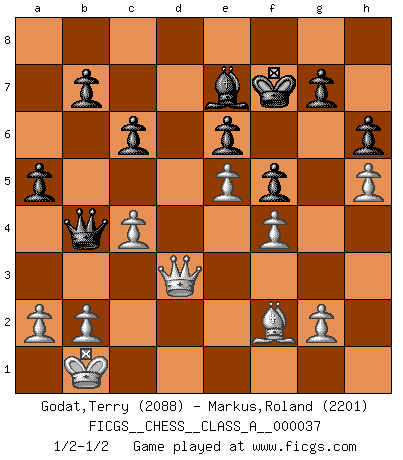 Last move : 1/2-1/2 2008 April 8 21:15:15 [Event "FICGS__CHESS__CLASS_A__000037"] [Site "FICGS"] [Date "2008.03.09"] [Round "1"] [White "Godat,Terry"] [Black "Markus,Roland"] [Result "1/2-1/2"] [WhiteElo "2088"] [BlackElo "2201"] 1.e4 c6 2.d4 d5 3.Nc3 dxe4 4.Nxe4 Bf5 5.Ng3 Bg6 6.h4 h6 7.Nf3 e6 8.Ne5 Bh7 9.Bd3 Bxd3 10.Qxd3 Nd7 11.f4 Bb4+ 12.c3 Be7 13.Bd2 Ngf6 14.O-O-O O-O 15.Qf3 Qc7 16.Ne4 Nxe4 17.Qxe4 f5 18.Qe2 Nxe5 19.dxe5 Rad8 20.h5 Rd5 21.Be3 Qa5 22.Kb1 Rfd8 23.c4 Rxd1+ 24.Rxd1 Rxd1+ 25.Qxd1 Qb4 26.Qe2 a5 27.Bf2 Kf7 28.Qd3 1/2-1/2 Caro-Kann : Classical, 6.h4 Queenside Castling by player White (move 14) Kingside Castling by player Black (move 14) This chess game ended in a draw. Follow this game move after move (download)There is no remorse like the remorse of Chess. (H. G. Wells) Das Schachspiel ist ein See, in welchem eine Mücke baden und ein Elefant ertrinken kann. (Emanuel Lasker) El ganar no lo es todo... pero el perder es nada. (Mednis) Les échecs sont un jeu par leur forme, un art par leur essence et une science par sa difficulté d'acquisition. Ils peuvent vous procurer autant de plaisir qu'un bon livre ou une belle musique, mais vous n'aurez une réelle joie que si vous arrivez à bien jouer. (Tigran Petrosian) When you have everything, sometimes it feels like nothing. (Horatio Caine, C.S.I. Miami)