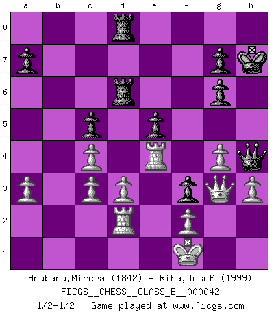 Last move : 1/2-1/2 2008 May 23 16:6:51 [Event "FICGS__CHESS__CLASS_B__000042"] [Site "FICGS"] [Date "2008.03.09"] [Round "1"] [White "Hrubaru,Mircea"] [Black "Riha,Josef"] [Result "1/2-1/2"] [WhiteElo "1842"] [BlackElo "1999"] 1.e4 c5 2.Nf3 Nc6 3.Bb5 d6 4.Bxc6+ bxc6 5.O-O Bg4 6.h3 Bh5 7.e5 e6 8.exd6 Nf6 9.Na3 Bxd6 10.Nc4 O-O 11.d3 Nd5 12.Re1 Re8 13.g4 Bg6 14.Nfe5 Bxe5 15.Nxe5 f6 16.Nxg6 hxg6 17.c4 Nb4 18.Re3 e5 19.a3 Na6 20.Qf3 Nc7 21.Qxc6 Ne6 22.Qe4 Kh7 23.Bd2 Nd4 24.Rd1 f5 25.Qh1 Qh4 26.Bc3 Rad8 27.Qg2 f4 28.Re4 f3 29.Qh2 Ne2+ 30.Kf1 Re6 31.Rd2 Nxc3 32.bxc3 Red6 33.Qg3 1/2-1/2 Sicilian : Nimzovich-Rossolimo attack (without ...d6) Kingside Castling by player White (move 5) Kingside Castling by player Black (move 10) This chess game ended in a draw. Follow this game move after move (download)The stomach is an essential part of the Chess master. (Bent Larsen) Drei Punkte vor allen anderen ist wie einer, der im weißen Anzug posiert, während der Rest in Müllsäcke gekleidet dasteht. (Viktor Kortschnoi) Siempre es mejor sacrificar los hombres de tu oponente. (Savielly Tartakower) Il n'y a pas eu de défaite parce que je ne crois pas que cet ordinateur ait jamais existé. IBM a triché en refusant d'imprimer les modes de recherche de la machine. C'est évident, pendant le match, des coups décisifs ont été joués par des êtres humains. Aujourd'hui, les meilleurs spécialistes en informatique ne peuvent toujours pas expliquer comment Deep-Blue a pu jouer contre la logique des ordinateurs. IBM a gagné une guerre de communication, mais ils sont incapables de prouver que l'ordinateur a gagné tout seul. (Garry Kasparov) How many people work in NATO Headquarters ? - About half of them. (Dirk Stikker, NATO general secretary)