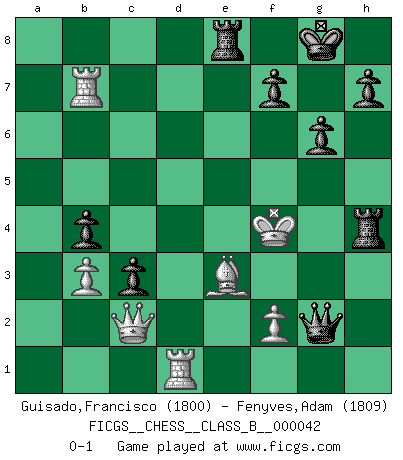 Last move : 0-1 2008 May 25 23:12:5 [Event "FICGS__CHESS__CLASS_B__000042"] [Site "FICGS"] [Date "2008.03.09"] [Round "1"] [White "Guisado,Francisco"] [Black "Fenyves,Adam"] [Result "0-1"] [WhiteElo "1800"] [BlackElo "1809"] 1.d4 d5 2.c4 e6 3.Nc3 c6 4.Nf3 dxc4 5.e3 b5 6.a4 Qb6 7.axb5 cxb5 8.b3 Bb4 9.Bd2 Bxc3 10.Bxc3 b4 11.Bd2 c3 12.Bc1 Nc6 13.Bd3 Nf6 14.O-O O-O 15.Qc2 Bb7 16.Ng5 g6 17.h4 Rad8 18.Ne4 Nxe4 19.Bxe4 e5 20.dxe5 Nxe5 21.Bxb7 Qxb7 22.e4 Nd3 23.Bh6 Rfe8 24.Be3 Qxe4 25.Rxa7 Qxh4 26.Rb7 Rd5 27.Rd1 Rh5 28.Kf1 Qh1+ 29.Ke2 Nf4+ 30.Kf3 Qxg2+ 31.Kxf4 Rh4+ 0-1 QGD : Semi-Slav, Noteboom variation Kingside Castling by player White (move 14) Kingside Castling by player Black (move 14) Player Black won this chess game. Follow this game move after move (download)A good sacrifice is one that is not necessarily sound but leaves your opponent dazed and confused. (Rudolph Spielmann) Es gibt Leute, die glauben, alles wäre vernünftig, was man mit einem ernsthaften Gesicht tut. (Georg Christoph Lichtenberg) Un mal día en el Ajedrez, es mejor que cualquier buen día en el trabajo. (Anonymous) L'attaque fait le spectacle, la défense gagne les matchs. (Dicton footballistique) Gambling is the son of avarice and the father of despair. (French proverb)