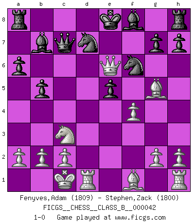 Last move : 1-0 2008 June 6 23:50:50 [Event "FICGS__CHESS__CLASS_B__000042"] [Site "FICGS"] [Date "2008.03.09"] [Round "1"] [White "Fenyves,Adam"] [Black "Stephen,Zack"] [Result "1-0"] [WhiteElo "1809"] [BlackElo "1800"] 1.e4 c5 2.Nf3 d6 3.d4 cxd4 4.Nxd4 Nf6 5.Nc3 a6 6.Bg5 e6 7.f4 Nbd7 8.Qf3 Qc7 9.O-O-O b5 10.e5 Bb7 11.Qh3 dxe5 12.Nxe6 fxe6 13.Qxe6+ 1-0 Sicilian : Najdorf, 7.f4 Queenside Castling by player White (move 9) Player White won this chess game. Follow this game move after move (download)When you see a good move, look for a better one. (Emanuel Lasker) Du musst Deinen Gegner in einen tiefen dunklen Wald führen wo 2+2=5 ist und wo der Weg, der wieder hinausführt, nur breit genug für einen ist. (Mikhail Nekhemyevich Tal) Yo jugué Ajedrez con el y a veces le pude haber ganado solo que siempre devuelve su última jugada y juega la partida de manera diferente. (Mark Twain) On est toujours la mazette de quelqu'un d'autre. (Anonyme) There is a great deal of difference between an eager man who wants to read a book and a tired man who wants a book to read. (G.K. Chesterton)