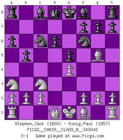 Last move : 0-1 2008 May 22 22:28:52 [Event "FICGS__CHESS__CLASS_B__000042"] [Site "FICGS"] [Date "2008.03.09"] [Round "1"] [White "Stephen,Zack"] [Black "Konig,Paul"] [Result "0-1"] [WhiteElo "1800"] [BlackElo "1857"] 1.e4 c5 2.Nf3 Nc6 3.d4 cxd4 4.Nxd4 Nf6 5.Nc3 e5 6.Ndb5 d6 7.Bg5 a6 8.Na3 b5 0-1 This chess game has been lost on time (started : 2008.03.09 10:26:26) Sicilian : Pelikan (Lasker/Sveshnikov) variation Player Black won this chess game. Follow this game move after move (download)Any material change in a position must come about by mate, a capture, or a Pawn promotion. (Purdy) Alle offensichtlichen Züge sehen nach dem Spiel in der Analyse verdächtig aus. (Viktor Kortschnoi) En posiciones complicadas, Bobby Fischer pocas veces tuvo que temer de cualquiera. (Paul Keres) Ce qui est bien, c'est d'avoir tout un tas de pièces en prise : l'adversaire ne peut en prendre qu'une à la fois. Cité par Thierry Audin. Computers make it easier to do a lot of things, but most of the things they make it easier to do don't need to be done. (Andy Rooney)