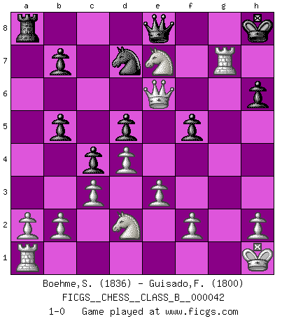 Last move : 1-0 2008 March 17 20:35:24 [Event "FICGS__CHESS__CLASS_B__000042"] [Site "FICGS"] [Date "2008.03.09"] [Round "1"] [White "Boehme,Sebastian"] [Black "Guisado,Francisco"] [Result "1-0"] [WhiteElo "1836"] [BlackElo "1800"] 1.d4 d5 2.Bg5 g6 3.Nf3 Bg7 4.e3 Nf6 5.Nbd2 O-O 6.c3 Bf5 7.Be2 Nbd7 8.O-O Re8 9.Nh4 e6 10.g4 h6 11.Bxf6 Bxf6 12.Ng2 Kh8 13.gxf5 gxf5 14.Kh1 c5 15.Bb5 c4 16.Nf4 a6 17.Qh5 Bg7 18.Qxf7 Re7 19.Ng6+ Kh7 20.Nxe7 axb5 21.Rg1 Qf8 22.Qg6+ Kh8 23.Qxe6 Qe8 24.Rxg7 1-0 Levitsky attack (Queen's Bishop attack) Kingside Castling by player Black (move 5) Kingside Castling by player White (move 8) Player White won this chess game. Follow this game move after move (download)Daring ideas are like Chess men moved forward. They may be beaten, but they may start a winning game. (Johann Wolfgang von Goethe) Karpov ist ein Museumsstück. (Garry Kasparov) ¿Cual es el objetivo de jugar una apertura de gambito?... Para adquirir una reputación de ser un jugador apuesto a costo de perder el juego. (Siegbert Tarrasch) Les sacrifices démontrent seulement que quelqu'un a gaffé. (Savielly Tartacover) When the going gets tactical, the computers get going. (Hyatt)