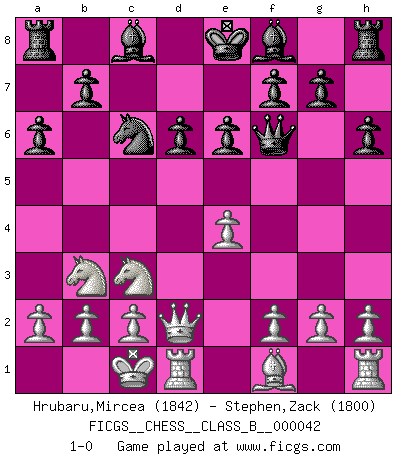 Last move : 1-0 2008 May 22 22:28:52 [Event "FICGS__CHESS__CLASS_B__000042"] [Site "FICGS"] [Date "2008.03.09"] [Round "1"] [White "Hrubaru,Mircea"] [Black "Stephen,Zack"] [Result "1-0"] [WhiteElo "1842"] [BlackElo "1800"] 1.e4 c5 2.Nf3 d6 3.d4 cxd4 4.Nxd4 Nf6 5.Nc3 a6 6.Bg5 e6 7.Qd2 h6 8.Bxf6 Qxf6 9.O-O-O Nc6 10.Nb3 1-0 This chess game has been lost on time (started : 2008.03.09 10:26:26) Sicilian : Najdorf, 6...e6 Queenside Castling by player White (move 9) Player White won this chess game. Follow this game move after move (download)Chess makes man wiser and clear-sighted. (Vladimir Putin) Ich glaube, ich kenne inzwischen die Gründe für mein Versagen: schachliche Charakterfehler. Ich war nie ein Wunderkind und in meiner gesamten menschlichen Entwicklung immer zu langsam. (Viktor Kortschnoi) El Ajedrez es imaginación. (David Bronstein) Karpov est une pièce de musée. (Garry Kasparov) Wipe them out. All of them. (Darth Sidious in Star Wars ep.1)