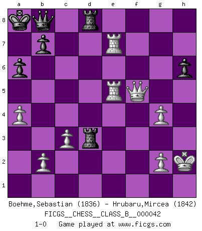 Last move : 1-0 2008 December 25 15:48:56 [Event "FICGS__CHESS__CLASS_B__000042"] [Site "FICGS"] [Date "2008.03.09"] [Round "1"] [White "Boehme,Sebastian"] [Black "Hrubaru,Mircea"] [Result "1-0"] [WhiteElo "1836"] [BlackElo "1842"] 1.e4 c6 2.d4 d5 3.Nc3 dxe4 4.Nxe4 Bf5 5.Ng3 Bg6 6.h4 h6 7.Nf3 e6 8.Ne5 Bh7 9.Bd3 Bxd3 10.Qxd3 Nd7 11.Bf4 Nxe5 12.Bxe5 Qa5+ 13.c3 Nf6 14.O-O Ng4 15.Rfe1 O-O-O 16.Qf3 Nxe5 17.Rxe5 Qc7 18.Re4 Bd6 19.a4 Bxg3 20.fxg3 c5 21.dxc5 Qxc5+ 22.Kh2 Rhf8 23.Rf1 Kb8 24.Rg4 Qe5 25.Rf2 Rd5 26.Re2 Qf6 27.Rf4 Qg6 28.g4 Ka8 29.h5 Qg5 30.Rxe6 Qd8 31.Kg3 Rd3 32.Re3 Rd7 33.Rfe4 a6 34.Kh3 Qc8 35.Qf5 Rfd8 36.Re7 g6 37.Qxf7 gxh5 38.Qxh5 Rd5 39.R3e5 Rd3+ 40.Kh2 Qb8 41.Qf5 1-0 Caro-Kann : Classical, 6.h4 Kingside Castling by player White (move 14) Queenside Castling by player Black (move 15) Player White won this chess game. Follow this game move after move (download)My opponents make good moves too. Sometimes I don't take these things into consideration. (Bobby Fischer) Wie gewinnt Tal? Er entwickelt alle seine Figuren in die Brettmitte und opfert sie dann irgendwo. (Robert James Fischer) No es suficiente ser un buen jugador, se debe también de jugar bién. (Siegbert Tarrasch) Le jeu d'échecs fait naître et fortifie en nous plusieurs qualités précieuses dans le cours de l'existence, telles que la prévoyance, la circonspection, la prudence, et la persévérance. (Benjamin Franklin - 1783, la morale des échecs) Perhaps chess is the wrong game for the times (The Chess Master and the Computer, by Garry Kasparov - 2010)