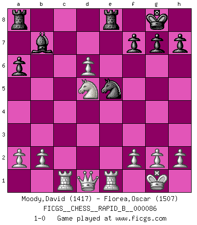 Last move : 1-0 2008 March 22 17:23:13 [Event "FICGS__CHESS__RAPID_B__000086"] [Site "FICGS"] [Date "2008.03.11"] [Round "1"] [White "Moody,David"] [Black "Florea,Oscar"] [Result "1-0"] [WhiteElo "1417"] [BlackElo "1507"] 1.e4 c6 2.d4 d5 3.exd5 cxd5 4.c4 Nf6 5.Nc3 e6 6.Nf3 Be7 7.c5 Nc6 8.Bb5 a6 9.Bxc6+ bxc6 10.O-O O-O 11.Ne5 Nd7 12.Nxc6 Qe8 13.Re1 Bb7 14.Nxe7+ Qxe7 15.Bf4 Rfe8 16.Rc1 Qf6 17.Bd6 e5 18.dxe5 Nxe5 19.Nxd5 Qxd6 20.cxd6 1-0 Caro-Kann : Panov-Botvinnik attack, 5...e6 Kingside Castling by player White (move 10) Kingside Castling by player Black (move 10) Player White won this chess game. Follow this game move after move (download)Modern Chess is too much concerned with things like Pawn structure. Forget it, Checkmate ends the game. (Nigel Short) Ich suche im Schach immer etwas Eigenes. Riskantes Spiel im Stile schachlicher Musketiere ist nicht meine Sache, auch wenn es vielen Freunden scharfer Wendungen gefällt. (Anatoly Karpov) El Ajedrez, como cualquier actividad creativa, solo puede existir a través del esfuerzo combinado de aquellos que tienen talento creativo y de aquellos que poseen la habilidad de organizar su trabajo creativo. (Mikhail Botvinnik) Seul un grand joueur sait à quel point il joue faiblement. (Xavier Tartacover) Man is reluctant to give credit for intelligence to anyone, except his enemies. (Albert Einstein)