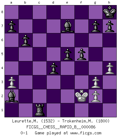 Last move : 0-1 2008 March 14 11:39:36 [Event "FICGS__CHESS__RAPID_B__000086"] [Site "FICGS"] [Date "2008.03.11"] [Round "1"] [White "Leurette,Marc-Antoine"] [Black "Trokenheim,Marek"] [Result "0-1"] [WhiteElo "1532"] [BlackElo "1800"] 1.e4 c5 2.Nf3 e6 3.d4 cxd4 4.Nxd4 Nf6 5.Nc3 d6 6.Bg5 Nc6 7.Bc4 Qb6 8.Be3 Qxb2 9.Nde2 Qb4 10.Bb3 Nxe4 11.O-O Nxc3 12.Qd2 Nxe2+ 13.Qxe2 Be7 14.a3 Qh4 15.c4 O-O 16.Rad1 f5 17.Qf3 Kh8 18.Rfe1 e5 19.Qg3 Qxg3 20.fxg3 Be6 21.Rb1 Na5 22.Rec1 Rfc8 23.Bd2 Nxb3 24.Rxb3 b6 25.Rbc3 Rc6 26.h4 Rac8 27.Be3 d5 28.Bd2 d4 29.R3c2 Rxc4 30.Ra2 Rxc1+ 31.Bxc1 Rxc1+ 32.Kf2 Bxa2 0-1 Sicilian : Anderssen variation Kingside Castling by player White (move 11) Kingside Castling by player Black (move 15) Player Black won this chess game. Follow this game move after move (download)All my games are real. (Bobby Fischer) Heutzutage gewinnt im Turnier nicht derjenige Spieler, der weitreichende Pläne entwirft, sondern einfach jener, der Zug um Zug kämpft. (David Bronstein) Fischer es una tragedia del Ajedrez Americano a la par con Morphy y Pillsbury. (Mig Greengard) Les échecs, c'est l'imagination. (David Bronstein) The leaves of memory seemed to make a mournful rustling in the dark. (Henry Wadsworth Longfellow)