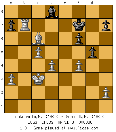 Last move : 1-0 2008 April 10 20:49:28 [Event "FICGS__CHESS__RAPID_B__000086"] [Site "FICGS"] [Date "2008.03.11"] [Round "1"] [White "Trokenheim,Marek"] [Black "Schmidt,Michael Wilhelm"] [Result "1-0"] [WhiteElo "1800"] [BlackElo "1800"] 1.b4 e5 2.Bb2 Bxb4 3.f4 d6 4.a3 Bc5 5.fxe5 dxe5 6.Bxe5 f6 7.Bc3 Bg4 8.Nf3 Ne7 9.e3 Nd5 10.Bb2 O-O 11.c4 Nb6 12.d4 Be7 13.c5 Nd5 14.Qb3 c6 15.e4 Bxf3 16.gxf3 Kh8 17.exd5 Qxd5 18.Qxd5 cxd5 19.Nc3 Rd8 20.O-O-O Nc6 21.f4 Na5 22.Bg2 Nc4 23.Nxd5 Re8 24.Nc7 Nxb2 25.Kxb2 Rab8 26.Nxe8 Rxe8 27.Rhe1 Kg8 28.Bxb7 Kf8 29.Rb1 Bd8 30.Rxe8+ Kxe8 31.Bc6+ Kf7 32.Kc3 g5 33.Rb7+ 1-0 Polish (Sokolsky) opening Kingside Castling by player Black (move 10) Queenside Castling by player White (move 20) Player White won this chess game. Follow this game move after move (download)The boy (then a 12 year old boy named Anatoly Karpov) doesn't have a clue about Chess, and there's no future at all for him in this profession. (Mikhail Botvinnik) Bis jetzt ist Weiß einer wohlbekannten Analyse gefolgt. Aber jetzt begeht er einen schrecklichen Fehler: Er beginnt seinen eigenen Kopf zu benutzen. (Siegbert Tarrasch) Prefiero perder una partida realmente buena, que ganar una mala. (David Levy) Vous savez, camarade Pachman, je n'éprouve pas de plaisir à être ministre, je jouerais plutôt aux échecs comme vous, ou alors ferais une révolution au Venezuela. (Che Guevara à Ludek Pachman, 'Checkmate in Prague', 1975) I find your interest interesting. (Gregory House, House M.D.)