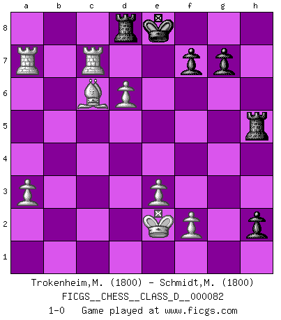Last move : 1-0 2008 April 16 17:13:39 [Event "FICGS__CHESS__CLASS_D__000082"] [Site "FICGS"] [Date "2008.03.11"] [Round "1"] [White "Trokenheim,Marek"] [Black "Schmidt,Michael Wilhelm"] [Result "1-0"] [WhiteElo "1800"] [BlackElo "1800"] 1.b4 e5 2.Bb2 Bxb4 3.Bxe5 Nf6 4.a3 Ba5 5.e3 O-O 6.Nf3 Nc6 7.Bb2 d5 8.Be2 Re8 9.O-O Bg4 10.d3 h6 11.Nbd2 Qd6 12.c4 Bxf3 13.Bxf3 Bxd2 14.cxd5 Nxd5 15.Qxd2 Ne5 16.Bxe5 Rxe5 17.Rfb1 Rb8 18.Qa5 a6 19.d4 Rg5 20.h4 Rf5 21.Be4 Rh5 22.g4 Rxh4 23.Qxd5 Rxg4+ 24.Kf1 Qxd5 25.Bxd5 b5 26.Rc1 Rg5 27.Bf3 Rc8 28.Bb7 Rb8 29.Rxc7 a5 30.Ke2 Kf8 31.Rb1 Ke8 32.d5 Rd8 33.Rxb5 h5 34.Rxa5 h4 35.Ra4 Rh5 36.Ra7 h3 37.d6 h2 38.Bc6+ 1-0 Polish (Sokolsky) opening Kingside Castling by player Black (move 5) Kingside Castling by player White (move 9) Player White won this chess game. Follow this game move after move (download)Chess is the gymnasium of the mind. (Blaise Pascal) Kasparov ist eine Art Monster mit hundert Augen, denen auch nicht das Geringste entgeht. (Tony Miles) El poder defensivo de una pieza clavada, solamente es imaginario. (Aaron Nimzovich) L'ordinateur a tué l'originalité. Il n'y a plus guère d'aventures sur l'échiquier. (Jacob Murray) Better than a thousand days of diligent study is one day with a great teacher. (Japanese proverb)
