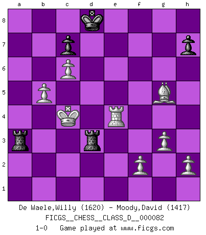 Last move : 1-0 2008 March 27 13:23:47 [Event "FICGS__CHESS__CLASS_D__000082"] [Site "FICGS"] [Date "2008.03.11"] [Round "1"] [White "De Waele,Willy"] [Black "Moody,David"] [Result "1-0"] [WhiteElo "1620"] [BlackElo "1417"] 1.e4 e5 2.Nf3 Nc6 3.Bb5 f5 4.Nc3 fxe4 5.Nxe4 Nf6 6.Qe2 d5 7.Nxf6+ gxf6 8.d4 e4 9.Nh4 Qe7 10.Bf4 Be6 11.O-O-O f5 12.g3 Bg7 13.Bxc6+ bxc6 14.Qa6 c5 15.dxc5 Rb8 16.c3 Kf7 17.Qc6 Rhc8 18.Rxd5 Bxd5 19.Qxd5+ Qe6 20.Qxf5+ Qxf5 21.Nxf5 Bf8 22.b4 a5 23.a3 axb4 24.cxb4 Ra8 25.Kb2 Ke6 26.Nd4+ Kd5 27.Rd1 Bg7 28.Kb3 Bxd4 29.Be3 Kc6 30.Rxd4 Rd8 31.Rxe4 Rd3+ 32.Kc4 R8xa3 33.b5+ Kd7 34.c6+ Kd8 35.Bg5+ 1-0 Ruy Lopez : Schliemann defense, Berger variation Queenside Castling by player White (move 11) Player White won this chess game. Follow this game move after move (download)Chess is like life. (Boris Spassky) Schach ist ein Teil der Kultur, und wenn es mit der Kultur abwärts geht, geht es auch mit dem Schach abwärts. (Mikhail Moiseyevich Botvinik) Si el Ajedrez es una ciencia, es la mas inexacta. Si el Ajedrez es un arte, es demasiado inexacto para ser visto como tal. Si el Ajedrez es un deporte, es demasiado esotérico. Si el Ajedrez es un juego, es demasiado exigente para ser solo un juego. Si el Ajedrez es una aventura, es una muy demandante. Si el Ajedrez es una pasión, es una muy gratificante. Si el Ajedrez es la vida, es una muy triste. (Anónimo) Les échecs, c'est l'imagination. (David Bronstein) Memory is a complicated thing, a relative to truth, but not its twin. (Barbara Kingsolver, Animal Dreams)