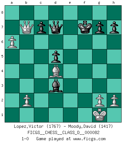 Last move : 1-0 2008 May 7 4:14:43 [Event "FICGS__CHESS__CLASS_D__000082"] [Site "FICGS"] [Date "2008.03.11"] [Round "1"] [White "Lopez,Victor"] [Black "Moody,David"] [Result "1-0"] [WhiteElo "1767"] [BlackElo "1417"] 1.e4 e5 2.Bc4 Nf6 3.d4 exd4 4.Nf3 Nc6 5.e5 d5 6.Bb5 Ne4 7.Nxd4 Bc5 8.Be3 Bd7 9.Bxc6 bxc6 10.O-O O-O 11.f3 Ng5 12.f4 Ne4 13.Nd2 Nxd2 14.Qxd2 f6 15.Rae1 fxe5 16.fxe5 Rxf1+ 17.Rxf1 Qe7 18.e6 Bxd4 19.Bxd4 Bxe6 20.Qc3 Rf8 21.Rxf8+ Qxf8 22.Qxc6 Qc8 23.a4 Qd7 24.Qa8+ Kf7 25.Qxa7 Bf5 26.a5 Bxc2 27.a6 Bd3 28.Qb7 1-0 Bishop's Opening : Urusov gambit Kingside Castling by player White (move 10) Kingside Castling by player Black (move 10) Player White won this chess game. Follow this game move after move (download)The defensive power of a pinned piece is only imaginary. (Aaron Nimzovich) Ich bin Weltmeister und muß mit niemandem irgend etwas diskutieren. (Viswanathan Anand) El Ajedrez es un terrible juego. Si no controlas el centro, tu oponente tiene una posición mas holgada. Si tienes control del centro, ¡entonces realmente tu tienes algo de que preocuparte!. (Siegbert Tarrasch) Ce n'est pas pour s'amuser qu'il joue aux échecs : il célèbre un culte. (Vladimir Nabokov) If you are good, you will be assigned all the work. If you are really good, you will get out of it. (Dan Rotaru)