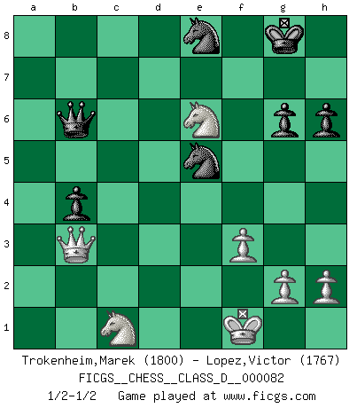 Last move : 1/2-1/2 2008 May 16 7:26:19 [Event "FICGS__CHESS__CLASS_D__000082"] [Site "FICGS"] [Date "2008.03.11"] [Round "1"] [White "Trokenheim,Marek"] [Black "Lopez,Victor"] [Result "1/2-1/2"] [WhiteElo "1800"] [BlackElo "1767"] 1.b4 c6 2.Bb2 Qb6 3.a3 a5 4.c4 axb4 5.c5 Qc7 6.axb4 Rxa1 7.Bxa1 Na6 8.Qb3 d6 9.d4 Nf6 10.Nf3 Be6 11.Qa4 g6 12.e4 Bg7 13.b5 cxb5 14.Bxb5+ Bd7 15.Nc3 O-O 16.Bxd7 Nxd7 17.Nd5 Qd8 18.cxd6 exd6 19.Nc3 Qc7 20.O-O Qc6 21.Qb3 Nc7 22.Rc1 Bh6 23.Rb1 Ra8 24.Bb2 Ra6 25.Ba3 b5 26.Bc1 Bxc1 27.Rxc1 Nf6 28.Ne2 Qb7 29.Ng5 Nce8 30.f3 Ra4 31.Kf1 h6 32.Nh3 Qa6 33.Nhf4 b4 34.e5 Ra1 35.Kf2 Rxc1 36.Nxc1 dxe5 37.dxe5 Nd7 38.e6 fxe6 39.Nxe6 Qb6+ 40.Kf1 Ne5 1/2-1/2 Polish : Outflank variation Kingside Castling by player Black (move 15) Kingside Castling by player White (move 20) This chess game ended in a draw. Follow this game move after move (download)The King is a fighting piece. Use it ! (Wilhelm Steinitz) Kleine Schachspieler machen Mist, und große Schachspieler machen Mist, aber große machen weniger Mist. (Fritz Sämisch) El Ajedrez es 99 por ciento táctica. (Teichmann) Le jeu d'échecs est comme rejeté hors du temps. (Antoine de Saint-Exupéry) Now the reason the enlightened prince and the wise general conquer the enemy whenever they move and their achievements surpass those of ordinary men is foreknowledge. (Sun Tzu)