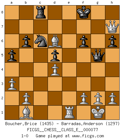 Last move : 1-0 2008 May 19 17:29:26 [Event "FICGS__CHESS__CLASS_E__000077"] [Site "FICGS"] [Date "2008.03.12"] [Round "1"] [White "Boucher,Brice"] [Black "Barradas,Anderson"] [Result "1-0"] [WhiteElo "1435"] [BlackElo "1297"] 1.c4 b6 2.Nc3 Bb7 3.Nf3 e6 4.d4 d5 5.e3 Bb4 6.Bd2 Nf6 7.Bd3 Ba6 8.Qa4+ c6 9.Qxb4 c5 10.Qa4+ Nfd7 11.Nb5 O-O 12.O-O Bxb5 13.Qxb5 a6 14.Qa4 cxd4 15.exd4 Re8 16.cxd5 exd5 17.Rfe1 Rxe1+ 18.Rxe1 a5 19.Bf4 h6 20.Ne5 Nxe5 21.Bxe5 Qe7 22.Qd1 Nc6 23.Bxg7 Qg5 24.Be5 Nb4 25.Bb1 Rc8 26.a3 Nc6 27.Qc2 f6 28.Qh7+ Kf8 29.Bd6+ 1-0 English Opening Kingside Castling by player Black (move 11) Kingside Castling by player White (move 12) Player White won this chess game. Follow this game move after move (download)Nothing excites jaded Grandmasters more than a theoretical novelty. (Dominic Lawson) Später, ... hatte ich zunehmend Erfolg in entscheidenden Partien. Vielleicht weil ich eine einfache Wahrheit erkannte: nicht nur ich hatte Angst, auch mein Gegner. (Mikhail Nekhemyevich Tal) En el Ajedrez, tal como en la vida, las bendiciones de hoy pueden ser el veneno del mañana. (Assaic) Assurément je connaissais par expérience le mystérieux attrait de ce jeu royal, le seul entre tous les jeux inventés par les hommes qui échappe souverainement à la tyrannie du hasard, le seul où l'on ne doive sa victoire qu'à son intelligence ou plutôt à une certaine forme d'intelligence. Mais n'est-ce pas déjà le limiter injurieusement que d'appeler les échecs un jeu ? N'est-ce pas une science, un art ou quelque chose qui, comme le cercueil de Mahomet entre ciel et terre, est suspendu entre l'un et l'autre, et qui réunit un nombre incroyable de contraires ? [...] C'est une pensée qui ne mène à rien, une mathématique qui n'établit rien, un art qui ne laisse pas d'uvre, une architecture sans matière; et il l'a prouvé néanmoins qu'il était plus durable, à sa manière, que les livres ou que tout autre monument, ce jeu unique qui appartient à tous les peuples et à tous les temps, et dont personne ne sait quel dieu en fit don à la terre pour tuer l'ennui, pour aiguiser l'esprit et stimuler l'âme. Où commence-t-il, où finit-il ? (Stefan Zweig) The Internet isn't free. It just has an economy that makes no sense to capitalism. (Brad Shapcott)