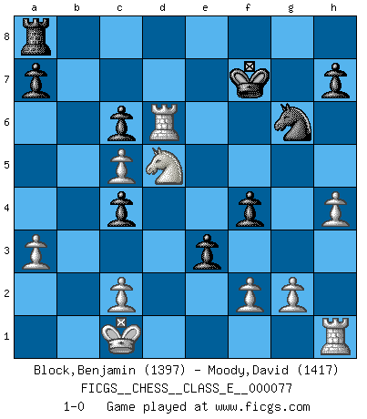 Last move : 1-0 2008 March 29 21:30:56 [Event "FICGS__CHESS__CLASS_E__000077"] [Site "FICGS"] [Date "2008.03.12"] [Round "1"] [White "Block,Benjamin"] [Black "Moody,David"] [Result "1-0"] [WhiteElo "1397"] [BlackElo "1417"] 1.e4 e6 2.d4 d5 3.Nc3 Bb4 4.e5 c5 5.a3 Bxc3+ 6.bxc3 Ne7 7.Qg4 O-O 8.Bd3 f5 9.exf6 Rxf6 10.Bg5 e5 11.Qh4 e4 12.Bxf6 gxf6 13.Be2 Ng6 14.Qg3 Nc6 15.dxc5 Qe7 16.h4 Kh8 17.Qe3 Qe5 18.O-O-O Be6 19.Bb5 f5 20.Bxc6 bxc6 21.Ne2 Qc7 22.c4 dxc4 23.Rd6 Bd5 24.Ng3 f4 25.Qd4+ Qg7 26.Qxg7+ Kxg7 27.Nh5+ Kf7 28.Nf6 e3 29.Nxd5 1-0 French : Winawer, Advance, poisoned pawn variation Kingside Castling by player Black (move 7) Queenside Castling by player White (move 18) Player White won this chess game. Follow this game move after move (download)Chess is a fighting game which is purely intellectual and includes chance. (Richard Reti) Im Leben werden Partien nie so unstrittig gewonnen wie im Spiel (Emanuel Lasker) Las ideas audaces son como las piezas del Ajedrez que avanzan hacia adelante. Ellas pueden ser vencidas, pero también pueden iniciar una partida victoriosa. (Goethe) Un footballeur joue avec ses pieds, parfois avec sa tête. Un joueur d'échecs ne joue qu'avec sa tête. Et quand il ne joue plus, il meurt. (Jacob Murray) Perhaps the current trend of many chess professionals taking up the more lucrative pastime of poker is not a wholly negative one. It may not be too late for humans to relearn how to take risks in order to innovate and thereby maintain the advanced lifestyles we enjoy. And if it takes a poker-playing supercomputer to remind us that we can't enjoy the rewards without taking the risks, so be it. (The Chess Master and the Computer, by Garry Kasparov - 2010)