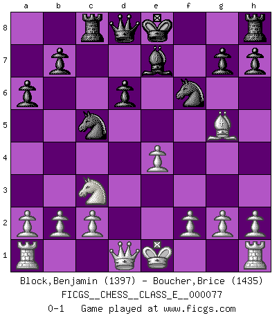 Last move : 0-1 2008 March 26 15:9:21 [Event "FICGS__CHESS__CLASS_E__000077"] [Site "FICGS"] [Date "2008.03.12"] [Round "1"] [White "Block,Benjamin"] [Black "Boucher,Brice"] [Result "0-1"] [WhiteElo "1397"] [BlackElo "1435"] 1.e4 c5 2.Nf3 d6 3.d4 cxd4 4.Nxd4 a6 5.Nc3 Nf6 6.Bg5 Nbd7 7.Bc4 e6 8.Bb3 Be7 9.Nxe6 fxe6 10.Bxe6 Nc5 11.Bxc8 Rxc8 0-1 Sicilian Player Black won this chess game. Follow this game move after move (download)Chess books should be used as we use glasses: to assist the sight, although some players make use of them as if they thought they conferred sight. (Jose Raul Capablanca) Wenn sie aufgeben, dann danke ich Ihnen für das Spiel (Eventualzug beim Fernschach). (Anonymous) El Ajedrez no es como la vida... ¡tiene reglas!. (Mark Pasternak) Je fais ceci parce que dans cinquante coups j'obtiendrai cela; je m'appelle Mikhail Moisevitch Botvinnik. (Botvinnik) Programming can only do so much before it becomes too much. (Don Groves)