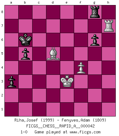 Last move : 1-0 2008 April 23 18:52:54 [Event "FICGS__CHESS__RAPID_A__000042"] [Site "FICGS"] [Date "2008.03.12"] [Round "1"] [White "Riha,Josef"] [Black "Fenyves,Adam"] [Result "1-0"] [WhiteElo "1999"] [BlackElo "1809"] 1.e4 d5 2.exd5 Qxd5 3.Nc3 Qa5 4.d4 Nf6 5.Nf3 Bg4 6.h3 Bh5 7.g4 Bg6 8.Ne5 e6 9.Bg2 c6 10.h4 Nbd7 11.Nxd7 Kxd7 12.d5 exd5 13.h5 Re8+ 14.Kf1 Qa6+ 15.Kg1 Be4 16.f3 Nxg4 17.Nxe4 Qb6+ 18.Kf1 Ne3+ 19.Bxe3 Qxe3 20.Nf2 Bc5 21.Nd3 Kc7 22.Nxc5 Qxc5 23.Rh4 Qb5+ 24.c4 dxc4 25.a4 Qxb2 26.Rxc4 Rd8 27.Qb1 Qxb1+ 28.Rxb1 Rd5 29.f4 Rxh5 30.Re4 Rf5 31.Ke2 Rb8 32.Bh3 Rf6 33.Rg1 g6 34.Ke3 b5 35.Re7+ Kb6 36.Rd1 Rg8 37.axb5 cxb5 38.R1d7 a6 39.Rxf7 Rxf7 40.Rxf7 a5 41.Bg2 a4 42.Rxh7 a3 43.Bd5 1-0 Scandinavian defense, Lasker variation 10 pieces endgame at move 40 : White KRBP , Black KRPPPP WHITE : King + 1 Rook 1 Bishop 1 Pawn BLACK : King + 1 Rook 4 Pawns 9 pieces endgame at move 42 : White KRBP , Black KRPPP WHITE : King + 1 Rook 1 Bishop 1 Pawn BLACK : King + 1 Rook 3 Pawns Player White won this chess game. Follow this game move after move (download)Different people feel differently about resigning. (Bobby Fischer) Es tut gut, die Entwicklungsperiode von, [...] demokratischem Geist durchdringen zu lassen. Wie undemokratisch wäre es doch beispielsweise, den einen Offizier große Spaziertouren vornehmen zu lassen, während die anderen zu Hause säßen und sich entsetzlich langweilten. (Aaron Nimzowitsch) El Ajedrez es un expediente tonto que hace creer a la gente inactiva que hacen una cosa muy astuta cuando solamente estan perdiendo su tiempo. (George Bernard Shaw) Que feriez-vous si vous étiez en train de jouer aux échecs et que la fin du monde arrive ? Je continuerais à jouer. (Saint Borromée) Always remember that you are unique; just like everyone else. (Unknown)