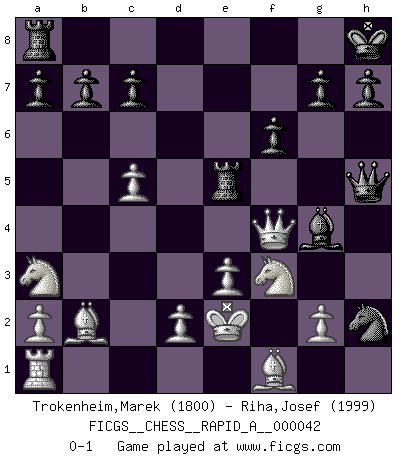 Last move : 0-1 2008 March 13 21:49:16 [Event "FICGS__CHESS__RAPID_A__000042"] [Site "FICGS"] [Date "2008.03.12"] [Round "1"] [White "Trokenheim,Marek"] [Black "Riha,Josef"] [Result "0-1"] [WhiteElo "1800"] [BlackElo "1999"] 1.b4 e5 2.Bb2 Bxb4 3.f4 Nh6 4.fxe5 Ng4 5.c3 Be7 6.Nf3 O-O 7.Qc2 Nc6 8.c4 d6 9.exd6 Bxd6 10.e3 Bxh2 11.Ke2 Re8 12.Rxh2 Nxh2 13.Qc3 Ne5 14.Nxe5 Qg5 15.Na3 f6 16.Nf3 Bg4 17.c5 Qh5 18.Qc4+ Kh8 19.Qf4 Re5 0-1 Polish (Sokolsky) opening Kingside Castling by player Black (move 6) Player Black won this chess game. Follow this game move after move (download)Chess demands total concentration. (Bobby Fischer) Im Schach gewinnt jeder. Hat man Freunde am Spiel - und das ist die Hauptsache - ist auch der Verlust einer Partie kein Unglück. (David Bronstein) Mis oponentes también hacen buenas movidas. A veces yo no tomo esas cosas en consideración. (Bobby Fischer) Karpov est une pièce de musée. (Garry Kasparov) Bobby never cared about money, though. His only desire was to prove that his choices were correct: He wanted chess to be important because he was a chess player, and he wanted to be important. Bobby knew money was important, but he didn't have a clue why, outside of clothes and status. The only way he could accomplish what he wanted was to fight for a lot of money. Once he got it, he gave it away. He did not know how to spend it. And once he'd become champion, after, essentially, sacrificing his life for it, he didn't know how to spend his time. (Bob Wade)