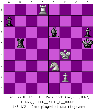 Last move : 1/2-1/2 2008 May 22 23:38:48 [Event "FICGS__CHESS__RAPID_A__000042"] [Site "FICGS"] [Date "2008.03.12"] [Round "1"] [White "Fenyves,Adam"] [Black "Perevozchikov,Vjacheslav"] [Result "1/2-1/2"] [WhiteElo "1809"] [BlackElo "1867"] 1.e4 e5 2.Nf3 Nc6 3.Bc4 Bc5 4.b4 Bxb4 5.c3 Ba5 6.d4 exd4 7.O-O Nf6 8.Ba3 d6 9.e5 Ne4 10.exd6 cxd6 11.Re1 O-O 12.Rxe4 d5 13.Rh4 dxc4 14.Bxf8 g5 15.Rxd4 Nxd4 16.Nxd4 Qxf8 17.Qc1 Qc5 18.Nd2 h6 19.h4 b5 20.a4 b4 21.cxb4 Bxb4 22.Qxc4 Qxc4 23.Nxc4 gxh4 24.Ne3 h3 25.Rb1 Bc5 26.Ndf5 Bxe3 27.Nxe3 hxg2 28.a5 Ba6 29.Kxg2 Kh7 30.Rd1 Rg8+ 31.Kf3 Rg5 32.Rd7 Rxa5 33.Rxf7+ Kg6 34.Rd7 Bc8 35.Rd6+ Kh5 36.Kf4 Rb5 37.Rd8 Be6 1/2-1/2 Evans gambit Kingside Castling by player White (move 7) Kingside Castling by player Black (move 11) 10 pieces endgame at move 32 : White KRNP , Black KRBPPP WHITE : King + 1 Rook 1 Knight 1 Pawn BLACK : King + 1 Rook 1 Bishop 3 Pawns 9 pieces endgame at move 33 : White KRNP , Black KRBPP WHITE : King + 1 Rook 1 Knight 1 Pawn BLACK : King + 1 Rook 1 Bishop 2 Pawns This chess game ended in a draw. Follow this game move after move (download)Up to this point White has been following well-known analysis. But now he makes a fatal error: he begins to use his own head. (Siegbert Tarrasch) Im Internet Chess Club betrug mein Rating vorübergehend 3350 ELO-Punkte. (Sergej Karjakin) El pensamiento metódico es mas útil en el Ajedrez que la inspiración. (C. J. S. Purdy) Lorsque vous vous retrouvez devant une position atroce, ne tendez pas un ultime piège dérisoire avec l'intention d'abandonner si l'adversaire le déjoue ! Faites-vous plutôt un devoir de résister comme si votre vie en dépendait. Jouez le coup qui vous déplairait au centuple si vous étiez dans la peau de votre tortionnaire ! Fear is the path to the dark side. Fear leads to anger; anger leads to hate; hate leads to suffering. I sense much fear in you. (Master Yoda in Star Wars ep.1)