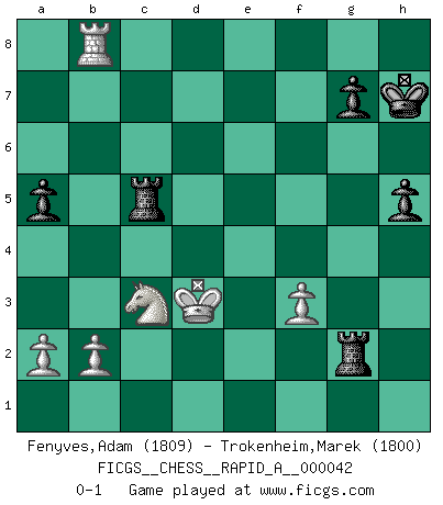 Last move : 0-1 2008 April 23 18:52:49 [Event "FICGS__CHESS__RAPID_A__000042"] [Site "FICGS"] [Date "2008.03.12"] [Round "1"] [White "Fenyves,Adam"] [Black "Trokenheim,Marek"] [Result "0-1"] [WhiteElo "1809"] [BlackElo "1800"] 1.e4 c5 2.Nf3 d6 3.d4 cxd4 4.Nxd4 Nf6 5.Nc3 Nc6 6.Bg5 e6 7.Qd2 Be7 8.O-O-O Nxd4 9.Qxd4 O-O 10.e5 dxe5 11.Qxe5 Bd7 12.h4 Qe8 13.Qg3 Kh8 14.h5 h6 15.Bf4 Bc6 16.Be5 Rg8 17.Bd3 Nd7 18.Bd4 Bf6 19.Be4 Bxd4 20.Rxd4 Nf6 21.Qe3 b5 22.f3 a5 23.Bxc6 Qxc6 24.Rf4 e5 25.Qxe5 b4 26.Ne4 Rgc8 27.c3 bxc3 28.Nxc3 Rab8 29.R1h4 Rb5 30.Rxf6 Rxe5 31.Rxc6 Rxc6 32.Kd2 R6c5 33.Rf4 Rxh5 34.Rxf7 Rh2 35.Kd3 Rxg2 36.Rb7 h5 37.Rb8+ Kh7 0-1 Sicilian : Richter-Rauzer, Rauzer attack, 7...Be7 Queenside Castling by player White (move 8) Kingside Castling by player Black (move 9) Player Black won this chess game. Follow this game move after move (download)The most important feature of the Chess position is the activity of the pieces. This is absolutely fundamental in all phases of the game: Opening, Middlegame and especially Endgame. The primary constraint on a piece's activity is the Pawn structure. (Michael Stean) Ein Isolani verdüstert die Stimmung auf dem ganzen Schachbrett. (Savielly Grigorievitsch Tartakower) Nada excita más a Grandes Maestros aburridos que una novedad teórica. (Dominic Lawson) Dans le domaine de la peinture, de la gravure et de la sculpture, dès la première décennie de notre siècle, les artistes abandonnent la représentation de la partie d'échecs pour se concentrer sur les pièces, sur les échiquiers et sur toutes les variations auxquelles les unes et les autres peuvent donner lieu. On passe en quelque sorte d'un thème social à un thème musical (au sens de la musica médiévale, c'est-à-dire d'une notion qui inclue le rythme, l'harmonie, la construction et la déconstruction, etc.). Graphiquement et picturalement, l'échiquier apparaît comme une structure ouverte, dynamique, d'une richesse infinie, autorisant toutes les combinatoires et débouchant sur des mouvements et des rythmes de nature exponentielle. (Michel Pastoureau) A cynic is a man who knows the price of everything but the value of nothing. (Oscar Wilde)
