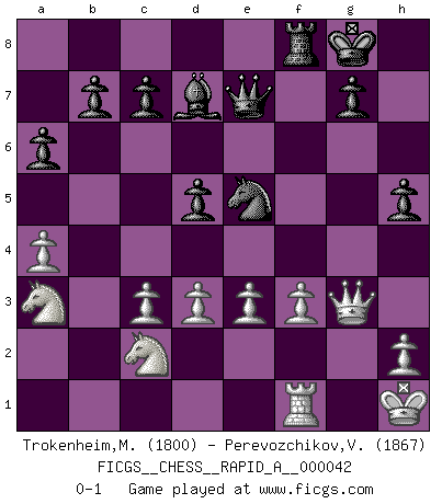 Last move : 0-1 2008 March 26 7:16:23 [Event "FICGS__CHESS__RAPID_A__000042"] [Site "FICGS"] [Date "2008.03.12"] [Round "1"] [White "Trokenheim,Marek"] [Black "Perevozchikov,Vjacheslav"] [Result "0-1"] [WhiteElo "1800"] [BlackElo "1867"] 1.b4 e5 2.Bb2 Bxb4 3.f4 Nc6 4.fxe5 f6 5.exf6 Nxf6 6.Nf3 d5 7.e3 Qe7 8.Be2 O-O 9.O-O Be6 10.Qe1 Ne4 11.a3 Ba5 12.a4 Rae8 13.Ba3 Bb4 14.c3 Bc5 15.Kh1 a6 16.d3 Nf6 17.Nd4 Bd7 18.Nc2 Ng4 19.Rxf8+ Rxf8 20.Bf3 Bxa3 21.Nbxa3 Nce5 22.Qg3 h5 23.Rf1 Nxf3 24.gxf3 Ne5 0-1 Polish (Sokolsky) opening Kingside Castling by player Black (move 8) Kingside Castling by player White (move 9) Player Black won this chess game. Follow this game move after move (download)There are two classes of men; those who are content to yield to circumstances and who play whist; those who aim to control circumstances, and who play Chess. (Mortimer Collins) Fischer machte Schach einfach zu einer aufregenden Sache, wann immer er sich ans Brett setzte. (Raymond Keene) Todos los Maestros de Ajedrez fueron un día unos principiantes. (Chernev) Soyez une menace à chaque fois que vous vous asseyez pour jouer. (Ken Smith) I don't believe in psychology. I believe in good moves. (Bobby Fischer)