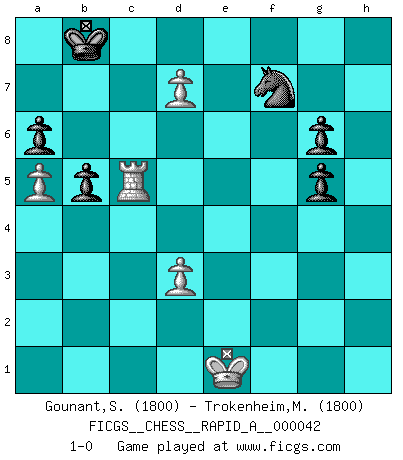 Last move : 1-0 2008 May 2 15:1:32 [Event "FICGS__CHESS__RAPID_A__000042"] [Site "FICGS"] [Date "2008.03.12"] [Round "1"] [White "Gounant,Stanislas"] [Black "Trokenheim,Marek"] [Result "1-0"] [WhiteElo "1800"] [BlackElo "1800"] 1.e4 c5 2.Nf3 d6 3.Bc4 Nf6 4.d3 Nc6 5.Bb3 Bg4 6.h3 Bh5 7.Nc3 e6 8.g4 Bg6 9.Bf4 Qb6 10.O-O O-O-O 11.a4 a6 12.e5 Ne8 13.Qe2 dxe5 14.Nxe5 Nd4 15.Qe3 Bd6 16.Nc4 Qc6 17.Bxd6 Nxd6 18.Ne5 Qc7 19.Ne2 Kb8 20.Rae1 f6 21.Nxg6 hxg6 22.Nxd4 cxd4 23.Qg3 e5 24.f4 exf4 25.Rxf4 Ka8 26.Rfe4 Rd7 27.Rxd4 Qb6 28.Qf2 Rxh3 29.c3 Qc7 30.Re6 Kb8 31.Bd5 Nf7 32.Re8+ Nd8 33.Kf1 Qh2 34.Be4 Rxd4 35.Qxh2+ Rxh2 36.cxd4 Kc8 37.d5 b5 38.a5 Rxb2 39.Bxg6 Ra2 40.Bf5+ Kc7 41.Re7+ Kb8 42.d6 Rc2 43.Re8 Rc8 44.g5 fxg5 45.Ke1 g6 46.Bg4 Kb7 47.Re7+ Kb8 48.Bxc8 Kxc8 49.Rc7+ Kb8 50.Rc5 Nf7 51.d7 1-0 Sicilian Kingside Castling by player White (move 10) Queenside Castling by player Black (move 10) Player White won this chess game. Follow this game move after move (download)Play the opening like a book, the middle game like a magician, and the endgame like a machine. (Spielmann) Schach ist die gewalttätigste aller Sportarten. (Garry Kasparov) El Ajedrez es un expediente tonto que hace creer a la gente inactiva que hacen una cosa muy astuta cuando solamente estan perdiendo su tiempo. (George Bernard Shaw) Fischer est le meilleur joueur du monde et Karpov n'est qu'un joueur de bistrot. (Garry Kasparov, agé de 16 ans) In my experience, there's no such thing as luck. (Obi-Wan Kenobi in Star Wars ep.4)