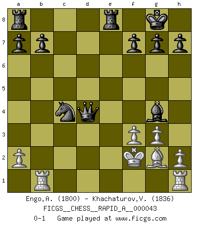 Last move : 0-1 2008 May 5 10:2:21 [Event "FICGS__CHESS__RAPID_A__000043"] [Site "FICGS"] [Date "2008.03.15"] [Round "1"] [White "Engo,Arne Sigvald"] [Black "Khachaturov,Vadim"] [Result "0-1"] [WhiteElo "1800"] [BlackElo "1836"] 1.c4 e5 2.Nc3 Nf6 3.g3 Bb4 4.Bg2 O-O 5.e3 Bxc3 6.bxc3 Re8 7.d4 d6 8.e4 exd4 9.cxd4 Nxe4 10.Be3 d5 11.Qd3 c5 12.Rd1 Nc6 13.Ne2 Bg4 14.Rb1 Qa5+ 15.Kf1 dxc4 16.Qxc4 cxd4 17.Nxd4 Nxd4 18.f3 Nd2+ 19.Kf2 Nxc4 20.Bxd4 Qd2+ 21.Kf1 Qd3+ 22.Kf2 Qxd4+ 0-1 English : Bremen, Smyslov system Kingside Castling by player Black (move 4) Player Black won this chess game. Follow this game move after move (download)It was clear to me that the vulnerable point of the American Grandmaster (Bobby Fischer) was in double-edged, hanging, irrational positions, where he often failed to find a win even in a won position. (Efim Geller) Kritik überlasse ich den Spießern. Ich zeige nichts, wofür ich mich schämen muss. (Alexandra Kosteniuk) El Ajedrez es una manera fabulosa para que los niños aprendan a autovalorarse y a autoestimarse. (Saudin Robovic) D'abord les bases : Jouez et étudiez, puis étudiez et jouez, ensuite jouez et étudiez, puis étudiez et jouez. Deuxièmement : Donnez toujours le meilleur de vous-même ! (Ken Smith) All politicians must be presumed guilty until they are proven innocent. (Dinesh De Silva)