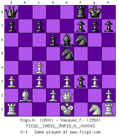 Last move : 0-1 2008 April 24 11:55:37 [Event "FICGS__CHESS__RAPID_A__000043"] [Site "FICGS"] [Date "2008.03.15"] [Round "1"] [White "Engo,Arne Sigvald"] [Black "Vasquez,Fernando"] [Result "0-1"] [WhiteElo "1800"] [BlackElo "1950"] 1.c4 e5 2.Nc3 Bb4 3.a3 Bxc3 4.bxc3 Nf6 5.g3 O-O 6.Bg2 d6 7.e3 Be6 8.Bxb7 Nbd7 9.Bxa8 Qxa8 10.f3 e4 11.Qe2 Ne5 12.Bb2 exf3 0-1 English, Kramnik-Shirov counterattack Kingside Castling by player Black (move 5) Player Black won this chess game. Follow this game move after move (download)You need not play well - just help your opponent to play badly. (Genrikh Chepukaitis) Ich verstehe den Grund nicht, warum die Aufteilung in Frauen und Männer überhaupt im Schach besteht. (Judith Polgar) Fischer deseaba darle a los Rusos una sopa de su propia medicina. (Larry Evans) Donnez-moi un Cavalier en 6e et je gagnerais toutes mes parties. (Steinitz) Big Chess is a place for big hallucinations. (Thibault de Vassal)
