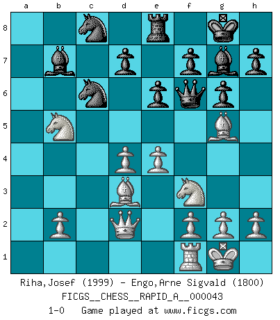 Last move : 1-0 2008 April 26 13:34:36 [Event "FICGS__CHESS__RAPID_A__000043"] [Site "FICGS"] [Date "2008.03.15"] [Round "1"] [White "Riha,Josef"] [Black "Engo,Arne Sigvald"] [Result "1-0"] [WhiteElo "1999"] [BlackElo "1800"] 1.e4 c5 2.c3 g6 3.Nf3 Bg7 4.d4 cxd4 5.cxd4 e6 6.Nc3 Ne7 7.Bd3 O-O 8.O-O a6 9.Bf4 b5 10.Qd2 Bb7 11.Bd6 Nbc6 12.a4 Re8 13.axb5 axb5 14.Nxb5 Nc8 15.Rxa8 Bxa8 16.Bc7 Qf6 17.Bf4 Bb7 18.Bg5 1-0 Sicilian : Alapin's variation (2.c3) Kingside Castling by player Black (move 7) Kingside Castling by player White (move 8) Player White won this chess game. Follow this game move after move (download)The winner of the game is the player who makes the next-to-last mistake. (Savielly Tartakover) Der Bart als Geschlechtszeichen mitten im Gesicht ist obszön. Daher gefällt er den Weibern. [Zugegeben, kein Schachzitat, aber unglaublich originell] (Arthur Schopenhauer) El Ajedrez es la vida. (Bobby Fischer) Même un GMI sait rarement calculer sur plus de cinq coups une attaque à sacrifices. (Rudolf Spielmann) I feel so... helpless. (C-3PO in Star Wars ep.3)