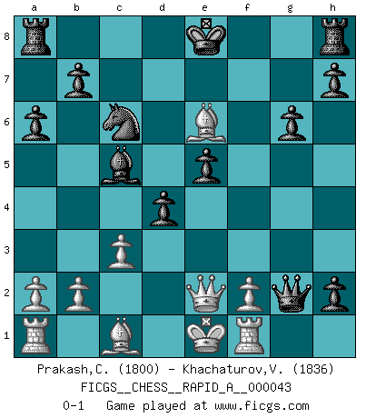 Last move : 0-1 2008 May 20 22:22:22 [Event "FICGS__CHESS__RAPID_A__000043"] [Site "FICGS"] [Date "2008.03.15"] [Round "1"] [White "Prakash,Chelva"] [Black "Khachaturov,Vadim"] [Result "0-1"] [WhiteElo "1800"] [BlackElo "1836"] 1.e4 c5 2.Nf3 d6 3.d4 cxd4 4.Nxd4 Nf6 5.Nc3 a6 6.Be2 e5 7.Nf5 d5 8.Ng3 d4 9.Nd5 Nxe4 10.Nxe4 Qxd5 11.Bd3 f5 12.Ng3 Qxg2 13.Qe2 Nc6 14.Qh5+ g6 15.Qe2 Be6 16.Bc4 f4 17.Bxe6 fxg3 18.Rf1 gxh2 19.c3 Bc5 0-1 This chess game has been lost on time (started : 2008.03.15 16:34:55) Sicilian : Najdorf, Opovcensky variation Player Black won this chess game. Follow this game move after move (download)I still hope to kill Fischer. (Boris Spassky) Ich kenne keine einzige Person, die behaupten würde, Garri Kasparow sei ein guter Mensch (Nigel Short) Cada Peón es una Reina en potencia. (James Mason) Botvinnik disait en comparant les échecs à la musique: Il existe une science dont le but est l'étude de l'acoustique et des sons. Mais il y a aussi un art qui se sert de l'océan des sons : c'est la musique. De toute évidence, il en est de même pour la pensée. La logique est l'étude des lois de la réflexion et les échecs reflètent, en tant qu'art, le côté logique de la réflexion, sous la forme d'images artistiques... Extrait de Fischer - Spassky, Reykjavik 1972 par Alexander & F. Wyndham (Ed. Solar), p 37. A proverb is a short sentence based on long experience. (Miguel de Cervantes)
