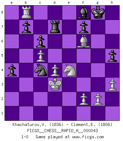 Last move : 1-0 2008 May 7 2:6:4 [Event "FICGS__CHESS__RAPID_A__000043"] [Site "FICGS"] [Date "2008.03.15"] [Round "1"] [White "Khachaturov,Vadim"] [Black "Clement,Etienne"] [Result "1-0"] [WhiteElo "1836"] [BlackElo "1806"] 1.e4 e5 2.Nf3 Nf6 3.Nxe5 d6 4.Nf3 Nxe4 5.d4 d5 6.Bd3 Nc6 7.O-O Be7 8.c4 Nb4 9.Be2 O-O 10.Nc3 Bf5 11.a3 Nxc3 12.bxc3 Nc6 13.Re1 Re8 14.cxd5 Qxd5 15.Bf4 Bd6 16.c4 Qe4 17.Be3 Rad8 18.Ra2 h6 19.h3 Qe7 20.Bd3 Bxd3 21.Qxd3 Qe4 22.Qc3 Qf5 23.Rae2 Qa5 24.Qxa5 Nxa5 25.c5 Bf8 26.Kf1 Re6 27.Bf4 Rxe2 28.Rxe2 Rd7 29.Re8 g5 30.Be5 Nc4 31.Bf6 c6 32.Rc8 h5 33.Nxg5 Nxa3 34.Ne4 Nc4 35.Ke2 a5 36.Rb8 a4 37.Kd3 1-0 Petrov : Classical attack Kingside Castling by player White (move 7) Kingside Castling by player Black (move 9) Player White won this chess game. Follow this game move after move (download)When in doubt... play Chess ! (Tevis) Zu meiner Zeit war ein 20 jähriger ein junger Spieler, heute ist er ein Veteran. (Garry Kasparov) La caracteristica mas importante en la posición del Ajedrez es la actividad de las piezas. Esto es absolutamente fundamental en todas las fases del juego: Apertura, Juego Medio y especialmente Finales. La limitación primordial en la actividad de una pieza, es la estructuración de los Peones. (Michael Stean) Les échecs sont plus proches de l'art de l'assassinat que de l'art de la guerre. (Arturo Perez-Reverte) All war is based on deception. (Sun Tzu)