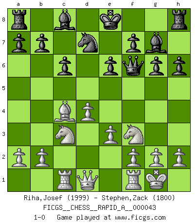 Last move : 1-0 2008 May 20 10:22:14 [Event "FICGS__CHESS__RAPID_A__000043"] [Site "FICGS"] [Date "2008.03.15"] [Round "1"] [White "Riha,Josef"] [Black "Stephen,Zack"] [Result "1-0"] [WhiteElo "1999"] [BlackElo "1800"] 1.d4 d5 2.c4 c6 3.Nf3 Nf6 4.Nc3 e6 5.Bg5 h6 6.Bxf6 Qxf6 7.e3 Nd7 8.Bd3 dxc4 9.Bxc4 g6 10.O-O Bg7 11.Rc1 1-0 This chess game has been lost on time (started : 2008.03.15 16:34:55) QGD Slav : 4.Nc3 Kingside Castling by player White (move 10) Player White won this chess game. Follow this game move after move (download)Chess is life. (Bobby Fischer) Ein Kibitz ist einer, der deinem Gegner gute Ratschläge gibt. (Andrew Soltis) Los Peones son nacidos libres, y aún así, se encuentran encadenados por todos lados. (Rick Kennedy) Mon pion favori sur ma case favorite ! Bronstein en parlant d'un coup de pion en h5 quand il avait les Noirs. May the force be with you. (Han Solo in Star Wars ep.4)
