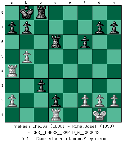 Last move : 0-1 2008 March 25 20:7:10 [Event "FICGS__CHESS__RAPID_A__000043"] [Site "FICGS"] [Date "2008.03.15"] [Round "1"] [White "Prakash,Chelva"] [Black "Riha,Josef"] [Result "0-1"] [WhiteElo "1800"] [BlackElo "1999"] 1.e4 d5 2.exd5 Nf6 3.Nc3 Nxd5 4.Qf3 e6 5.Nxd5 Qxd5 6.Qxd5 exd5 7.d4 Nc6 8.Nf3 Bg4 9.Ne5 Nxd4 10.Bd3 Bf5 11.Bxf5 Nxf5 12.O-O Nd4 13.Rb1 Nxc2 14.Rd1 f6 15.Nf3 O-O-O 16.Nd4 Nxd4 17.Rxd4 c5 18.Ra4 Kb8 19.Bf4+ Bd6 20.Bxd6+ Rxd6 21.b4 c4 22.b5 Rc8 23.Re1 d4 24.Re7 d3 25.Re1 d2 26.Rd1 c3 0-1 Scandinavian defense Kingside Castling by player White (move 12) Queenside Castling by player Black (move 15) Player Black won this chess game. Follow this game move after move (download)Human affairs are like a Chess game: only those who do not take it seriously can be called good players. (Hung Tzu Ch'eng) Matt entspricht nicht immer den Tatsachen. (Savielly Grigorievitsch Tartakower) Si tu oponente no puede hacer nada activo, entonces no apures la posición; En vez de eso, dejalo estar sentado ahí, sufriendo y rogandote por un empate. (Jeremy Silman) Les pièces de l'échiquier étaient impitoyables. Elles le retenaient, elles l'absorbaient. Il y avait de l'horreur en cela, mais aussi une harmonie unique. Car, qu'y a-t-il dans le monde, à part les échecs ? (V. Nabokov) If everyone is thinking alike, then somebody isn't thinking. (US General George S. Patton)