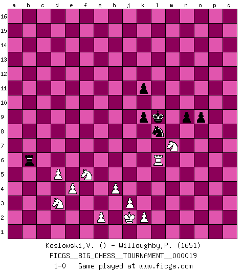 Last move : 1-0 2009 February 15 20:7:11 [Event "FICGS__BIG_CHESS__TOURNAMENT__000019"] [Site "FICGS"] [Date "2008.03.17"] [Round "1"] [White "Koslowski,Volker"] [Black "Willoughby,Peter"] [Result "1-0"] [WhiteElo ""] [BlackElo "1651"] 1.j2-h4 j15-h13 2.h1-l4 l15-l14 3.l4-c12 e15-e14 4.c12-c15 b16-c14 5.c15-h10 n15-n13 6.h10-f10 h15-j13 7.d2-d4 f15-f13 8.n2-n4 p16-o14 9.e2-e4 m15-m13 10.d4-d5 b15-b14 11.f10-k10 j13-l12 12.k10-g10 l16-m15 13.g10-g14 h16-h15 14.g14-h15 k16-h15 15.c1-j7 c16-b15 16.j7-f10 k15-k14 17.p1-o3 o16-l13 18.f1-b5 c14-e13 19.k1-l3 f16-c13 20.f10-c13 b14-c13 21.b1-d2 l13-m12 22.d2-c4 l14-l13 23.b5-m15 m16-m15 24.m2-m4 o14-n12 25.l1-o4 e13-g12 26.o1-f9 k14-k13 27.g1-f3 g16-f14 28.o4-k8 e14-e13 29.f3-e5 q16-n16 30.a2-a4 g12-e11 31.f9-j6 h15-g13 32.q2-q3 e16-e14 33.l3-m5 o15-o13 34.m1-m3 j16-h15 35.m3-l3 n16-n14 36.e1-e3 n14-p14 37.p2-p4 f13-f12 38.e3-b3 b15-j8 39.h4-f5 e14-b14 40.l3-l7 b14-b3 41.c2-b3 a16-b16 42.l7-j7 j8-f11 43.j7-c7 d15-d14 44.c7-q7 q15-q14 45.q7-a7 b16-a16 46.k8-h6 p14-p6 47.j6-d11 f14-e12 48.b3-b4 d14-d13 49.d11-k5 j14-j13 50.j1-j2 f11-c8 51.o3-n5 p6-p11 52.k5-j6 m12-n11 53.h6-n11 l12-n11 54.a7-a8 c8-b9 55.a8-k8 k13-k12 56.k8-h8 h13-j11 57.h2-j4 e11-g10 58.h8-d8 d13-d12 59.n5-o7 p15-p13 60.e5-f7 a15-a13 61.q1-m1 a13-a12 62.m1-m3 a12-a11 63.d8-q8 m15-m14 64.m3-l3 a11-a10 65.l3-l9 a16-a11 66.f7-d8 b9-d11 67.j6-d11 a11-d11 68.d8-c6 p11-o11 69.l9-l7 j11-k9 70.l7-b7 g10-h8 71.q8-q10 a10-a9 72.q10-a10 d11-d9 73.a10-a11 n12-m10 74.o7-p9 o11-p11 75.p9-n10 p11-o11 76.b4-b5 m13-m12 77.o2-o4 o11-q11 78.a1-q1 o13-o12 79.a11-a16 q11-q10 80.n10-l9 k9-m8 81.l9-m11 m14-m13 82.b7-h7 h8-g6 83.h7-m7 m8-o9 84.m7-g7 g6-f8 85.g7-g8 f8-e10 86.a16-b16 m10-o11 87.g8-k8 n11-m9 88.k8-l8 m9-l11 89.c6-e7 d9-m9 90.m11-l9 o11-n9 91.l8-l6 q10-l10 92.l6-o6 n9-p8 93.o6-o8 m9-l9 94.o8-p8 l9-l2 95.e7-c8 l2-m2 96.b16-b9 o9-q10 97.p8-n8 m2-m4 98.b9-a9 l10-n10 99.n8-n10 l11-n10 100.a9-n9 m12-m11 101.n9-e9 d12-d11 102.c8-b10 g13-f11 103.e9-f9 f11-g9 104.b10-d11 e12-g11 105.f9-f6 m4-n4 106.d11-e13 g9-h7 107.f6-q6 q10-p12 108.e13-d11 c13-c12 109.d11-e13 c12-c11 110.q1-l1 j13-j12 111.l1-l7 e10-f8 112.e13-d11 f12-f11 113.d11-e9 f11-f10 114.e9-d11 g11-h9 115.l7-p7 p12-n11 116.q6-q14 n11-o9 117.p7-p13 o9-n7 118.m5-n7 n4-n7 119.p13-p15 h15-g14 120.q14-q15 n7-n4 121.p15-g15 g14-h13 122.d11-f12 h13-h12 123.q15-q14 h14-h13 124.q14-h14 l13-l12 125.h14-l14 l12-l11 126.l14-k14 k12-k11 127.o4-o5 n4-n3 128.g15-q15 n10-m8 129.k14-c14 f8-d9 130.f12-e10 n13-n12 131.e10-c11 d9-c11 132.c14-c11 h7-j5 133.c11-c9 h9-g11 134.c9-c8 m8-l6 135.h3-h4 j5-g4 136.q15-g15 g4-f2 137.c8-h8 h12-j13 138.g15-g11 n3-q3 139.g11-g13 j13-j14 140.g13-g6 l6-j7 141.g6-g14 j14-j13 142.g14-g13 j13-h14 143.g13-g7 j7-k9 144.h8-k8 k9-m10 145.f5-g3 m13-p13 146.k8-f8 f2-d3 147.f8-f10 p13-p4 148.f10-f14 h14-j13 149.g7-l7 l11-l10 150.l7-m7 m10-k9 151.m7-o7 o12-o11 152.o7-n7 k9-m10 153.f14-f13 d3-c5 154.n7-h7 c5-a4 155.f13-h13 j13-k12 156.h13-c13 q3-o3 157.h7-a7 a4-b2 158.c4-b2 o3-o5 159.b2-d3 k12-l11 160.a7-j7 n12-n11 161.j7-j12 n11-n10 162.c13-l13 l11-k10 163.j12-m12 k10-l9 164.m12-m11 p4-p8 165.l13-f13 o5-k5 166.f13-f9 k5-k9 167.f9-k9 l10-k9 168.m11-l11 l9-k10 169.l11-l6 p8-b8 170.b5-b6 m10-l8 171.g3-f5 n10-n9 172.l6-o6 l8-m10 173.o6-c6 o11-o10 174.c6-m6 k10-l9 175.m6-o6 o10-o9 176.o6-l6 m10-l8 177.j4-k6 b8-b6 178.k6-m7 1-0 Follow this game move after move (download)You must take your opponent into a deep dark forest where 2+2=5, and the path leading out is only wide enough for one. (Mikhail Tal) Ich tröste mich mit dem Vergnügen, daß Schachfans, Zuschauer und Leser glücklich sind, wenn ein Großmeister etwas riskiert, statt nur Klötzchen zu schieben. (Mikhail Nekhemyevich Tal) Un jugador que trata de regresar una movida en el Ajedrez es un futuro carterista. (Richard Fenton) Le pion, dans sa simplicité, marche droit devant lui, mais lorsqu'il prend, il le fait obliquement? Ainsi l'homme, tant qu'il reste pauvre, marche dans la droiture et vit honnêtement, mais lorsqu'il recherche les honneurs, il flatte, se parjure et, par les voies obliques, cherche une position supérieure sur l'échiquier du monde. (Jean de Galles) We're missing something. (Gregory House, House M.D.)
