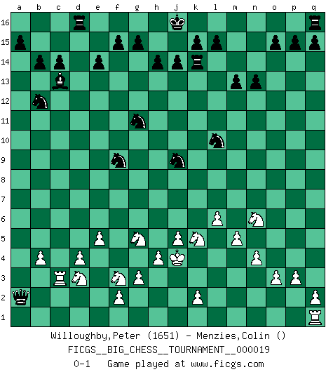 Last move : 0-1 2008 June 7 22:30:48 [Event "FICGS__BIG_CHESS__TOURNAMENT__000019"] [Site "FICGS"] [Date "2008.03.17"] [Round "1"] [White "Willoughby,Peter"] [Black "Menzies,Colin"] [Result "0-1"] [WhiteElo "1651"] [BlackElo ""] 1.j2-h4 n15-n14 2.m2-m4 j15-k13 3.d2-d4 m15-m13 4.l2-l4 b15-b14 5.n2-n4 c16-b15 6.m4-m5 e15-e14 7.l4-l5 p16-q14 8.e2-e4 o16-g9 9.l1-n3 f16-c13 10.h4-j6 h16-l13 11.c1-h6 g16-f14 12.f1-d3 n14-n13 13.g1-f3 l16-o13 14.b1-d2 k16-l14 15.p1-o3 q14-p12 16.o3-m4 l14-k12 17.l5-l6 h15-j13 18.h2-k3 k13-j11 19.n3-o4 m16-m14 20.e4-e5 o13-d3 21.c2-d3 j13-k11 22.o2-o3 k12-j10 23.a1-c1 m14-o14 24.m4-n6 o14-o4 25.n6-o4 l13-o10 26.p2-p3 f14-g12 27.h3-h4 g12-h10 28.o1-q3 k11-j9 29.h1-h3 j10-g11 30.k1-l3 p12-n11 31.g2-g3 n11-l10 32.m1-m4 g9-m4 33.k3-m4 c13-m4 34.c1-c15 b15-c14 35.q3-o1 b16-a14 36.c15-c14 d15-c14 37.h6-j5 o10-l13 38.o4-n6 m4-c13 39.j5-f8 j11-h9 40.f8-d6 l13-h13 41.o1-k5 a14-b12 42.d2-e4 e16-d16 43.j1-j2 h10-f9 44.b2-b4 h13-a6 45.e1-e2 a6-d3 46.e2-e3 d3-c4 47.h3-b9 c4-c10 48.b9-e6 d16-d12 49.e3-c3 c10-a10 50.e4-c5 a10-e6 51.j2-k3 e6-a2 52.c5-d3 d12-d6 53.j6-g5 d6-k6 54.j3-j4 h9-j7 55.j4-j5 k6-k14 56.k3-j4 j7-k5 57.l3-k5 a16-d16 0-1 Follow this game move after move (download)A thorough understanding of the typical mating continuations makes the most complicated sacrificial combinations leading up to them not only not difficult, but almost a matter of course. (Siegbert Tarrasch) Charakterschwächen offenbaren sich normalerweise während einer Schachpartie. (Garry Kasparov) Me siento como si fuera una pieza en una partida de Ajedrez, cuando mi oponente me indica: esa pieza no puede ser movida. (Soren Kierkegaard) Le génie consiste à savoir transgresser les règles au moment opportun. (Teichmann) Lottery : A tax on people who are bad at math. (Author unknown)