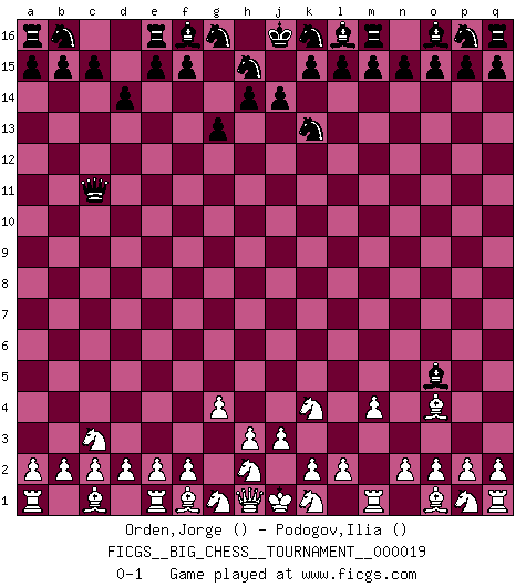 Last move : 0-1 2008 April 28 20:50:43 [Event "FICGS__BIG_CHESS__TOURNAMENT__000019"] [Site "FICGS"] [Date "2008.03.17"] [Round "1"] [White "Orden,Jorge"] [Black "Podogov,Ilia"] [Result "0-1"] [WhiteElo ""] [BlackElo ""] 1.m2-m4 g15-g13 2.l1-o4 d15-d14 3.g2-g4 h16-c11 4.b1-c3 c16-o5 5.j2-k4 j15-k13 0-1 This big chess game has been lost on time (started : 2008.03.17 3:4:58) Follow this game move after move (download)A win by an unsound combination, however showy, fills me with artistic horror. (Wilhelm Steinitz) Ich trinke, ich rauche, ich spiele, ich liebe Frauen aber Fernschach ist ein Laster, das ich nicht habe. (Mikhail Nekhemyevich Tal) El Ajedrez es una manera fabulosa para que los niños aprendan a autovalorarse y a autoestimarse. (Saudin Robovic) On a dit que l'homme se distingue de l'animal par le fait qu'il achète plus de livres qu'il ne peut en lire. Je voudrais suggérer qu'inclure à la liste des livres quelques livres d'échecs rendrait la distinction manifeste. (Edward Lasker) The obstacle is the path. (Zen proverb)
