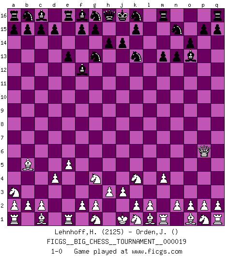 Last move : 1-0 2008 April 30 8:56:29 [Event "FICGS__BIG_CHESS__TOURNAMENT__000019"] [Site "FICGS"] [Date "2008.03.17"] [Round "1"] [White "Lehnhoff,Heinz-Georg"] [Black "Orden,Jorge"] [Result "1-0"] [WhiteElo "2125"] [BlackElo ""] 1.h2-g4 h15-g13 2.j2-k4 e15-e13 3.h1-o7 o15-o14 4.m2-m4 n15-n13 5.e2-e4 o16-d6 6.e4-e5 d6-c5 7.o7-c7 c5-h10 8.c7-l15 p16-n15 9.d2-d4 j15-k13 10.l15-l10 h10-f12 11.b1-a3 m15-m13 12.f1-b5 l16-o13 13.l10-p6 1-0 This big chess game has been lost on time (started : 2008.03.17 3:4:58) Follow this game move after move (download)First-class players lose to second-class players because second-class players sometimes play a first-class game. (Siegbert Tarrasch) Die Auseinandersetzung mit Karpow war politisch geprägt. Er stand für das kommunistische System, wurde von dessen Repräsentanten gehätschelt. Ich war der Oppositionelle. Jeder Schachweltmeister spiegelt auch die gesellschaftlichen Verhältnisse wider. Kramnik steht für die Börsen-Generation des Neuen Markts, ideologiefrei, zahlenfixiert. (Garry Kasparov) No puedes jugar al Ajedrez si eres de corazón noble. (Proverbio Francés) Je ne suis pas le dernier à jouer lâchement des coups douteux pendant le zeïtnot de l'adversaire pour l'achever: en effet les coups qui font le plus peur sont ceux que l'on ne comprend pas. Je me fais souvent peur quand je joue. (Un professeur anonyme) Live, lose, and learn, by observing your opponent how to win. (Amber Steenbock)