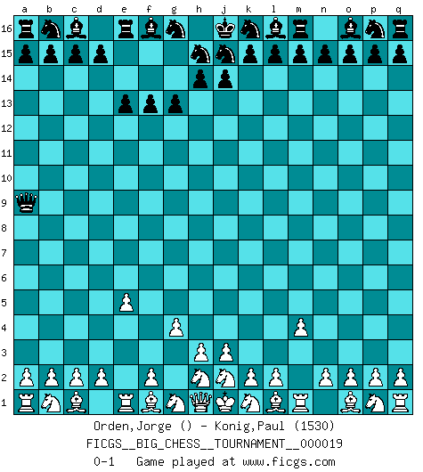 Last move : 0-1 2008 May 5 9:11:49 [Event "FICGS__BIG_CHESS__TOURNAMENT__000019"] [Site "FICGS"] [Date "2008.03.17"] [Round "1"] [White "Orden,Jorge"] [Black "Konig,Paul"] [Result "0-1"] [WhiteElo ""] [BlackElo "1530"] 1.m2-m4 g15-g13 2.e2-e4 f15-f13 3.g2-g4 h16-a9 4.e4-e5 e15-e13 0-1 This big chess game has been lost on time (started : 2008.03.17 3:4:58) Follow this game move after move (download)A Chess game is a dialogue, a conversation between a player and his opponent. Each move by the opponent may contain threats or be a blunder, but a player cannot defend against threats or take advantage of blunders if he does not first ask himself: What is my opponent planning after each move ? (Bruce A. Moon) In Buenos Aires ist es nicht mein vorrangiges Ziel ein starkes Turnier zu organisieren, sondern ein Turnier für Gentlemen. Ich würde nie Kamsky einladen. Ich mag keine Probleme. (Miguel Najdorf) Si tu oponente no puede hacer nada activo, entonces no apures la posición; En vez de eso, dejalo estar sentado ahí, sufriendo y rogandote por un empate. (Jeremy Silman) Les échecs sont un jeu terrible. Si vous n'avez pas le centre, votre adversaire a une position plus libre. Par contre, si vous avez le centre, alors vous avez vraiment quelque chose pour laquelle vous inquiéter ! (Siegbert Tarrasch) Every vice is only an exaggeration of a necessary and virtuous function. (Ralph Waldo Emerson, Journals 1936)