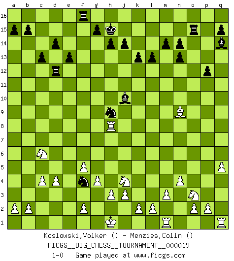 Last move : 1-0 2008 November 6 7:53:41 [Event "FICGS__BIG_CHESS__TOURNAMENT__000019"] [Site "FICGS"] [Date "2008.03.17"] [Round "1"] [White "Koslowski,Volker"] [Black "Menzies,Colin"] [Result "1-0"] [WhiteElo ""] [BlackElo ""] 1.j2-h4 p16-o14 2.h1-l4 k16-l14 3.l4-c12 d15-d14 4.c12-f15 g16-f14 5.f15-b11 e15-e13 6.n2-n4 b16-c14 7.d2-d4 c14-d12 8.b11-g11 m15-m14 9.o1-g8 f16-e15 10.c1-p13 j15-h13 11.g11-n11 h16-n11 12.p13-n11 l16-n14 13.g8-n14 o15-n14 14.k1-l3 o14-m13 15.n11-k8 c16-k9 16.e2-e4 p15-p14 17.k8-j9 l14-n13 18.f1-b5 o16-q14 19.m2-m3 q16-o16 20.p1-o3 k9-p4 21.b1-c3 f14-g12 22.b5-g10 c15-c14 23.l1-n3 h13-j11 24.g10-j12 e16-f16 25.g1-f3 k15-k13 26.j12-k11 l15-l13 27.q2-q3 p4-k9 28.j9-g11 h15-j13 29.k11-m9 n13-l12 30.h4-f5 m13-l11 31.m9-p12 n14-n13 32.p12-k7 l12-k10 33.k7-e12 j16-j15 34.f3-e5 l11-j10 35.g11-j9 k10-h9 36.n3-k6 j13-h11 37.j9-m6 g12-f10 38.e12-g14 j11-l10 39.k6-q12 p14-p13 40.q12-j5 d12-f13 41.e1-e3 h11-j13 42.e3-g3 j13-g14 43.g3-g14 j10-g11 44.m6-h10 j15-h15 45.g14-e14 a16-e16 46.e14-e15 e16-e15 47.l3-m5 f13-h12 48.j5-b12 c14-c13 49.b12-k4 p13-p12 50.k4-n7 g11-j10 51.c3-d5 e15-f15 52.h2-j4 h12-f11 53.h10-l7 l10-k8 54.l7-q12 m16-m15 55.q12-k6 f11-g9 56.m5-l7 k9-n12 57.n7-p5 n15-n14 58.l7-n8 m15-o15 59.k6-j5 f10-g8 60.a1-e1 k8-h7 61.j5-n9 j10-h8 62.n8-m10 n12-l10 63.q3-q4 g9-e8 64.q4-q5 e8-g7 65.g2-g4 h7-f6 66.d5-f6 g8-f6 67.p5-l9 f15-f12 68.l9-e15 g7-f5 69.e15-f16 o16-f16 70.e4-f5 f12-d12 71.e5-c6 f6-d5 72.e1-e8 h8-k9 73.m10-k9 l10-k9 74.c2-c4 d5-f4 75.e8-h8 k9-j10 76.j1-h1 1-0 This big chess game has been lost on time (started : 2008.03.17 3:4:58) Follow this game move after move (download)Chess is played with the mind and not with the hands ! (Renaud and Kahn) Es gibt nur zwei wahre Schachgenies - das andere war Wilhelm Steinitz, der Weltmeister von 1872 bis 1894. (Robert James Fischer) El juego del Ajedrez no es solamente una diversión quieta; algunas cualidades muy valuables de la mente se pueden adquirir y cultivar con el, como convertirlos en habitos disponibles para toda ocasión; ya que la vida es algo así como el Ajedrez. (Benjamin Franklin) Le plus grand jeu de l'esprit jamais inventé, plus vous l'apprenez, plus vous y prenez du plaisir. (Garry Kasparov) You can't play chess if you're groggy from pills. (Anatoly Karpov)