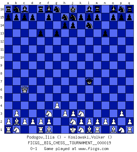 Last move : 0-1 2008 April 27 20:47:31 [Event "FICGS__BIG_CHESS__TOURNAMENT__000019"] [Site "FICGS"] [Date "2008.03.17"] [Round "1"] [White "Podogov,Ilia"] [Black "Koslowski,Volker"] [Result "0-1"] [WhiteElo ""] [BlackElo ""] 1.g2-g4 g15-g13 2.h1-c6 h16-f14 3.g1-f3 e15-e13 4.b2-b3 f14-f7 5.h2-k3 n15-n13 6.c1-b2 k16-l14 7.p2-p3 f7-l7 0-1 This big chess game has been lost on time (started : 2008.03.17 3:4:58) Follow this game move after move (download)In the perfect Chess combination as in a first-rate short story, the whole plot and counter-plot should lead up to a striking finale, the interest not being allayed until the very last moment. (Yates and Winter) Ich verstehe den Grund nicht, warum die Aufteilung in Frauen und Männer überhaupt im Schach besteht. (Judith Polgar) El juego de Fischer siempre fue nítido, racional y brillante. Uno de los mejores por siempre. (Dave Regis) Si je n'étais pas joueur d'échecs, je serais le meilleur dans quelque chose d'autre. (Anatoli Karpov) When I took office, only high energy physicists had ever heard of what is called the World Wide Web... Now even my cat has its own page. (Bill Clinton, 1996)